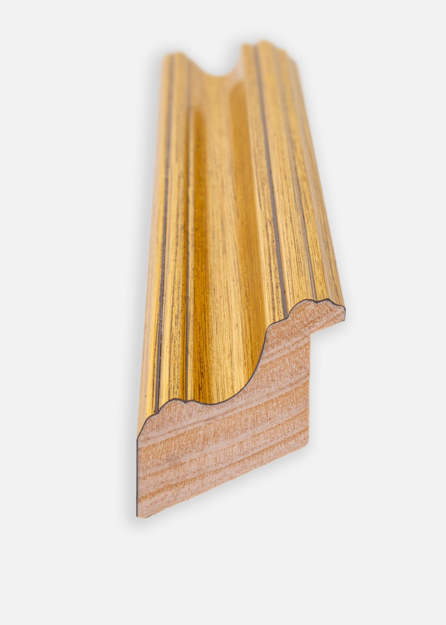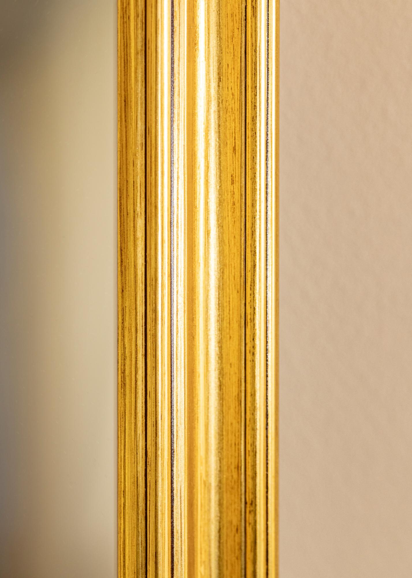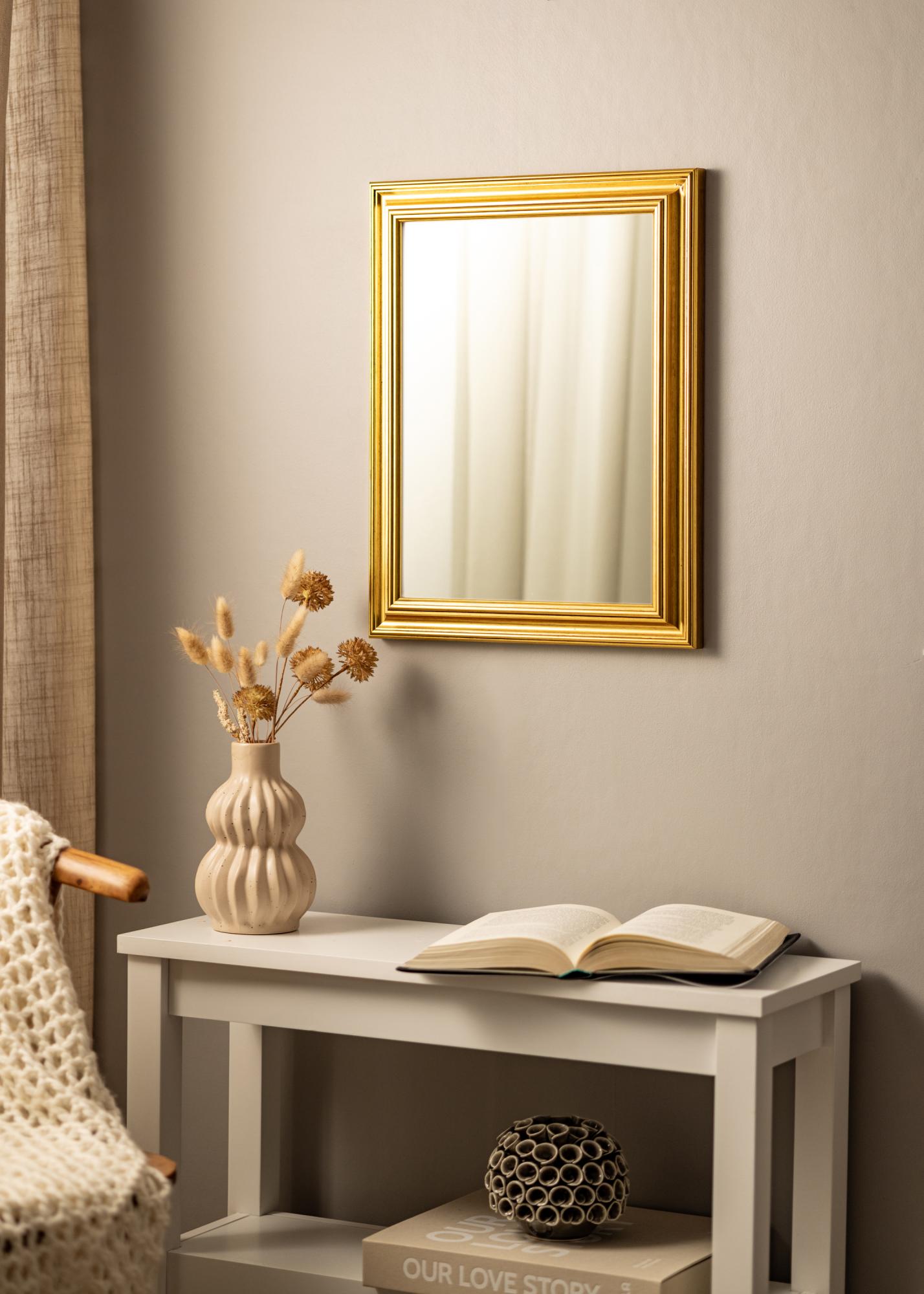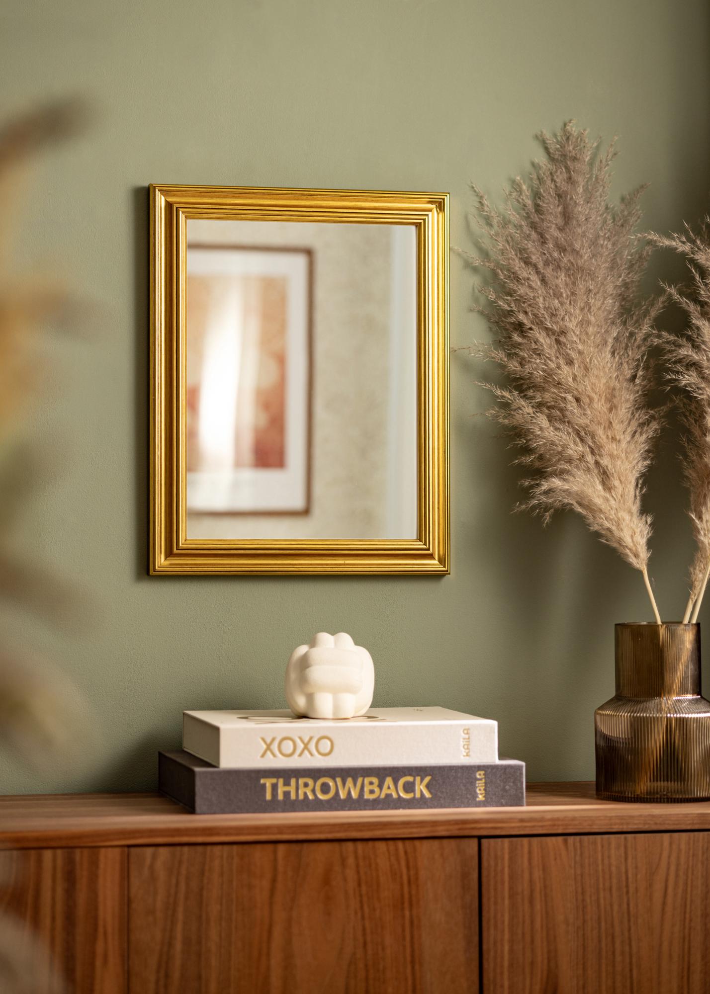 Klassikaliselt profileeritud kullakarva peegel puidust raamiga, mis tundub käsitsi maalituna, see annab peeglile elava tunde ja kena läike. Lai raamiliist annab peeglile eksklusiivse välimuse ja võimaldab peegli sobitada nii antiiksete mööbliesemetega koju kui ka moodsasse koju, kus on romantiline või elegantne sisekujundus. Kombineerige peegel meeleldi messingist küünlahoidikute ja kullaraamiga piltidega, et luua ruumis terviklik tunne.