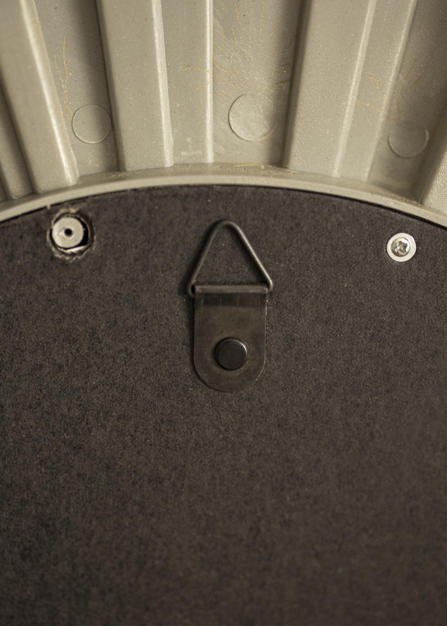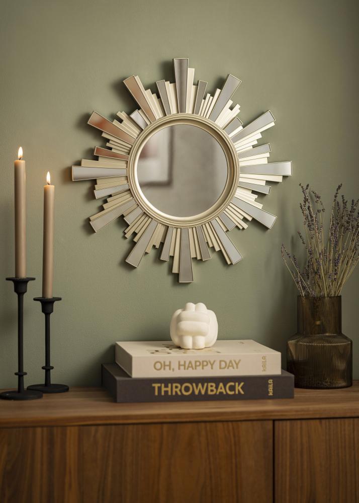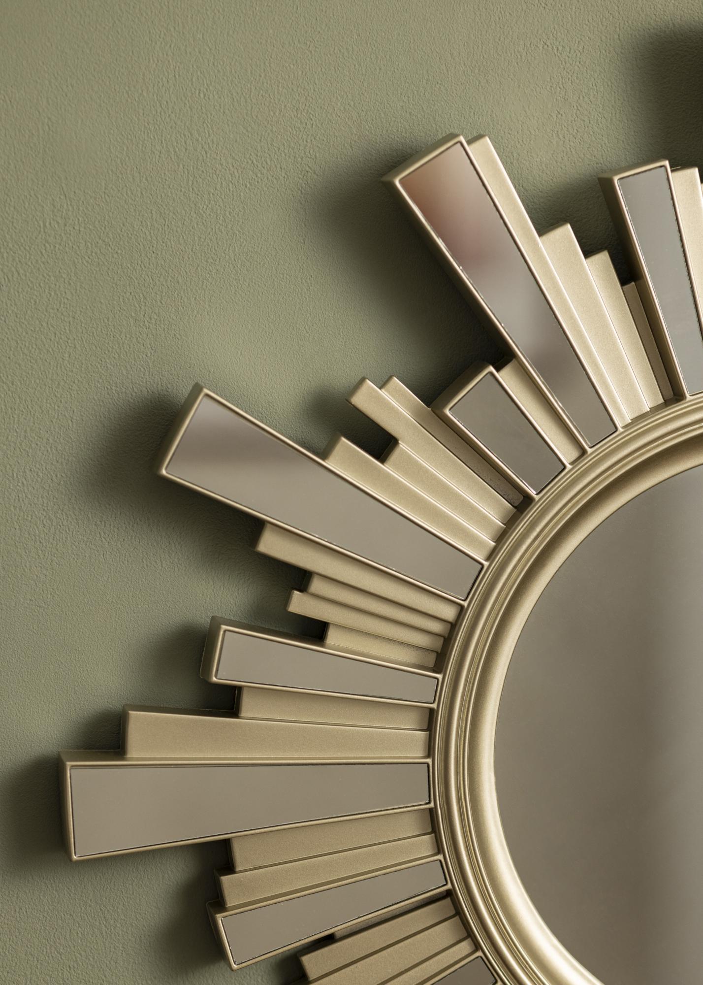 See ümmargune peegel on väga dekoratiivse raamiga, mis on päikese kujuline. Raam on kullavärvi, mis annab peeglile elegantse ja puhta ilme.