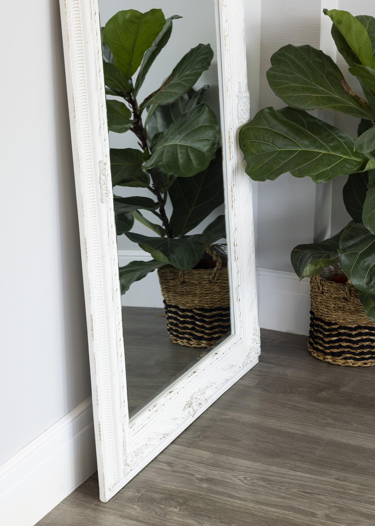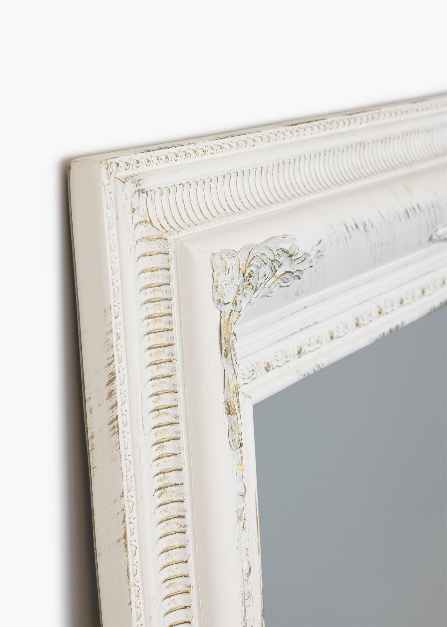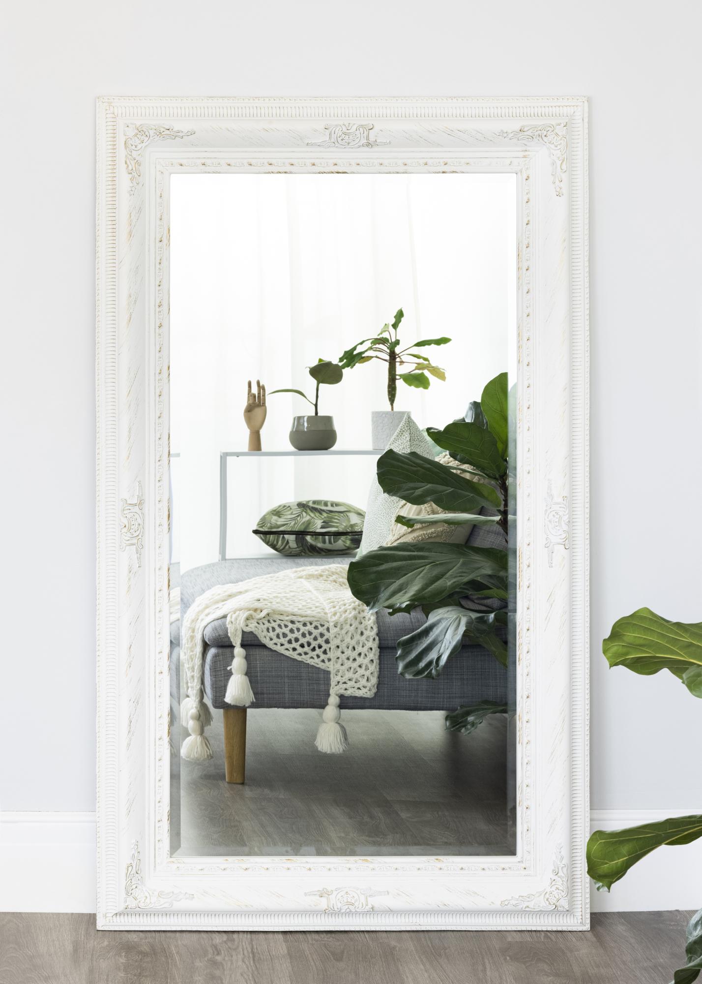 Peegel valges koos romantilise tundega, ideaalne neile, kes soovivad luua interjööri, mis õhkab roose, glamuuri ja möödunud aegu. Peegel sobib nii vannituppa suurema mööbli kohale kui ka mujale koju, suurus teeb selle sobilikuks paigutamiseks seinale suure kapi või diivani kohale. Peeglit saab kasutada ka osana pildiseinast, kus maalid on raamitud valgete sarnase stiiliga raamidesse, ning aitab valgustada tumedamat ruumi, kui riputada see akna vastas.