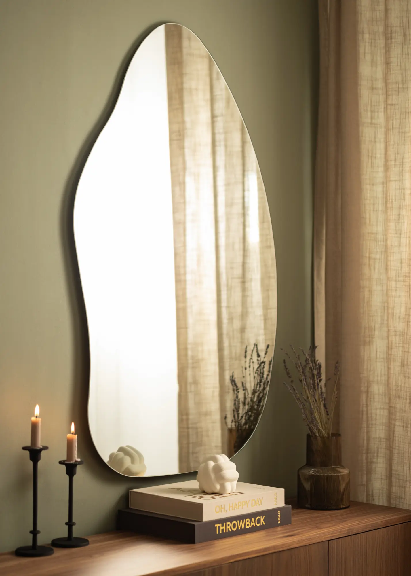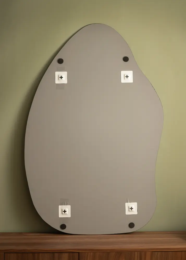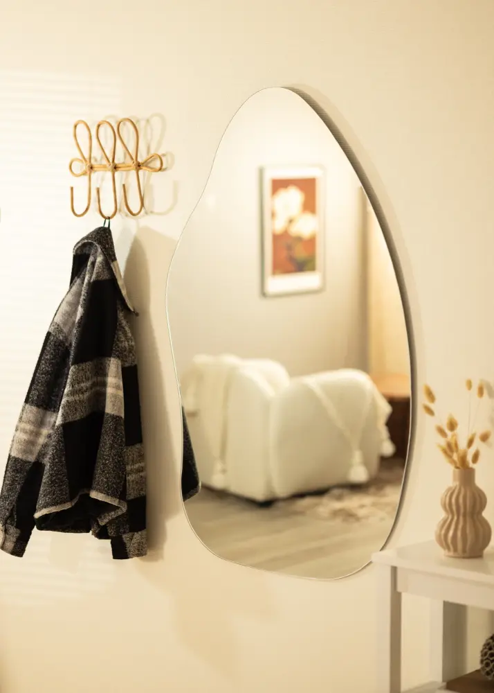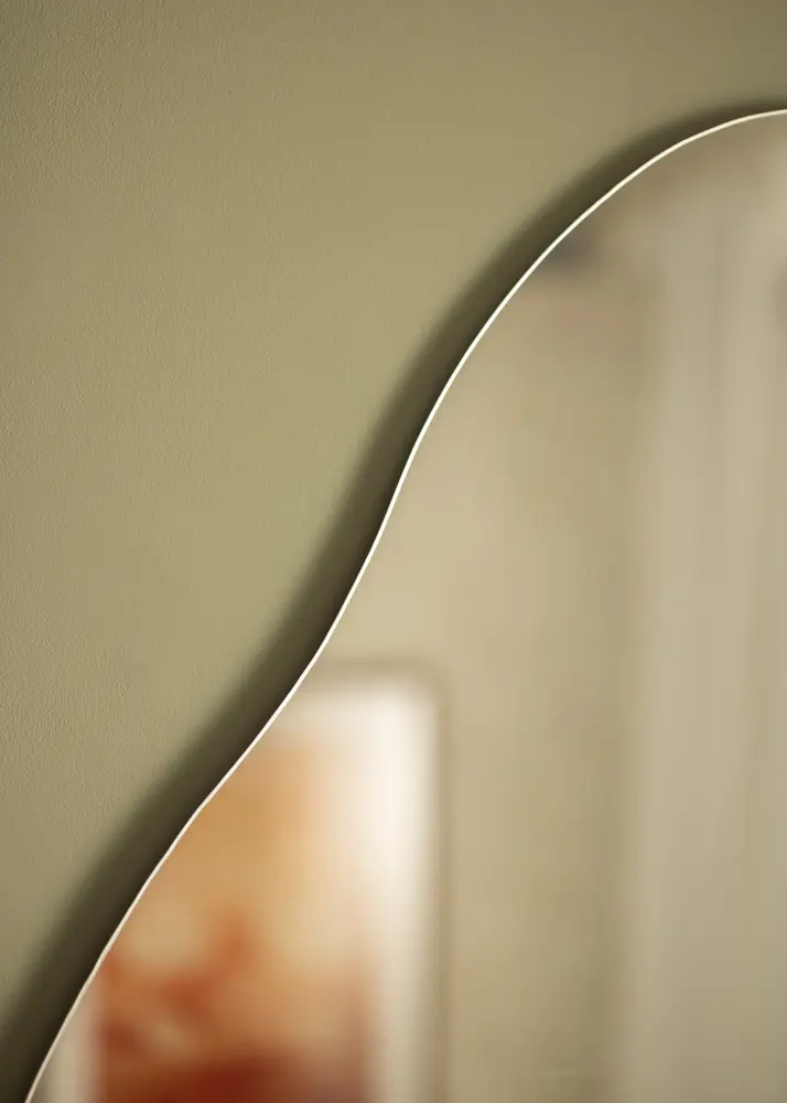 Peeglil on pehme ja orgaaniline kuju, mis meenutab veepiiska või püstist lehte, andes toale elegantse ja moodsa tunde. See unikaalne kuju muudab peegli vestluse alustajaks ja kunstiteoseks omaette, täites samas ka oma praktilist funktsiooni.