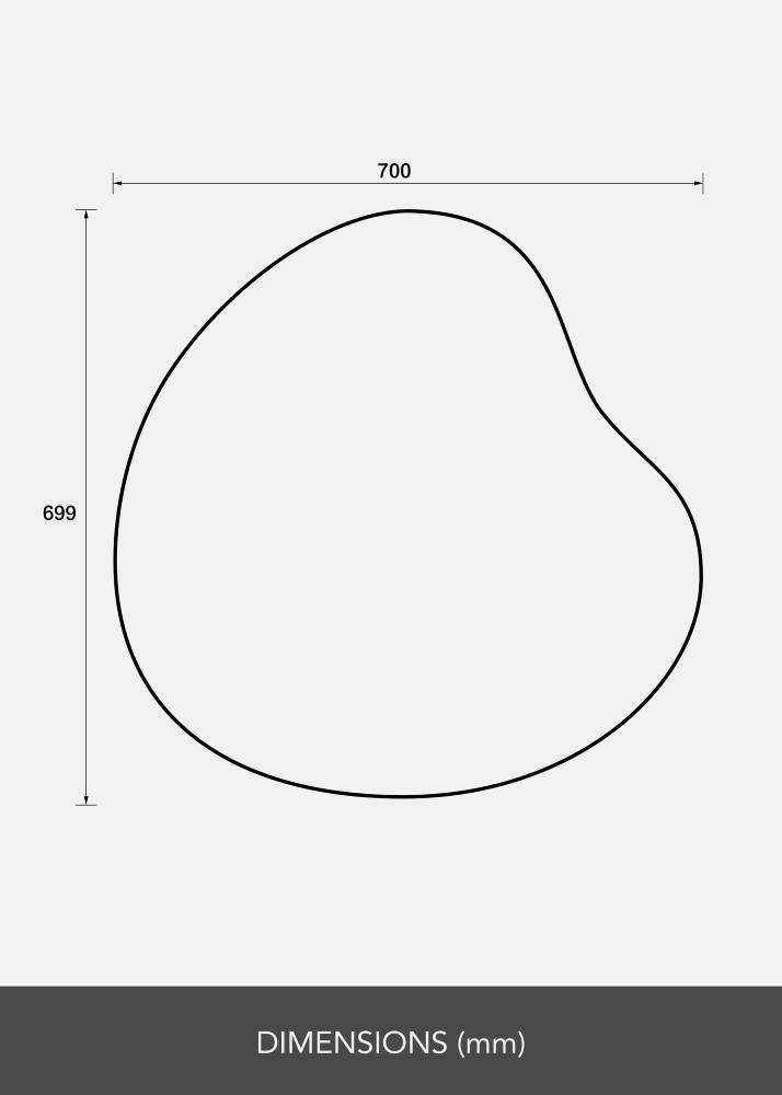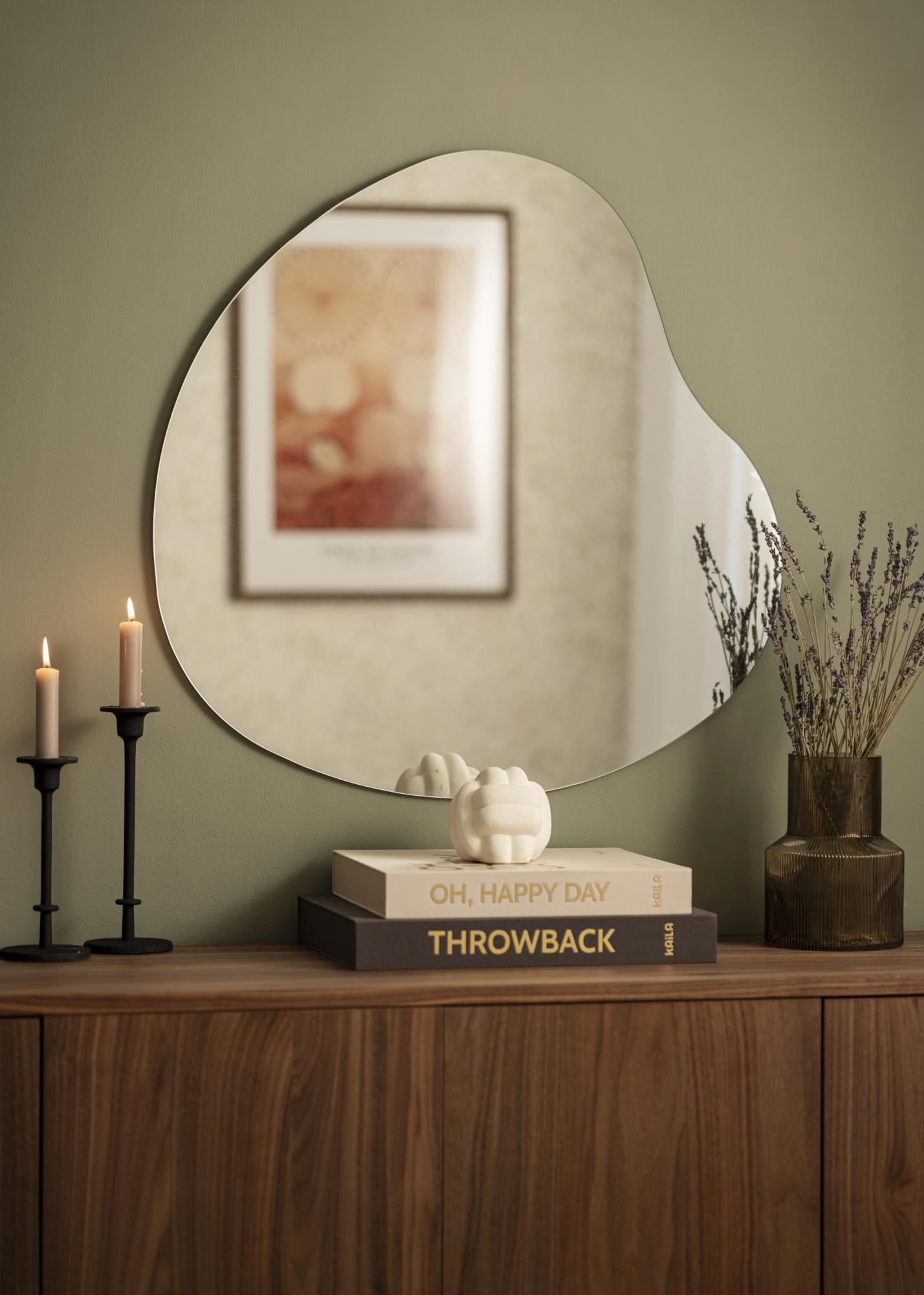 Peeglil on pehmelt kontuuritud, asümmeetriline vorm, mis kaardub graatsiliselt ja annab liikumise ja pehmuse mulje. See disain muudab peegli kunstiliseks detailiks seinal, samas säilitades selle praktilise funktsiooni.