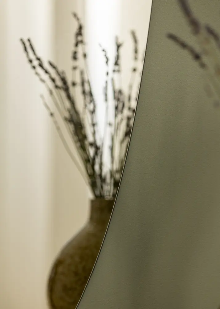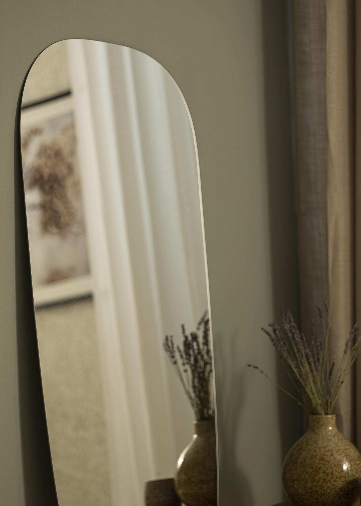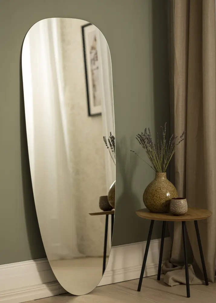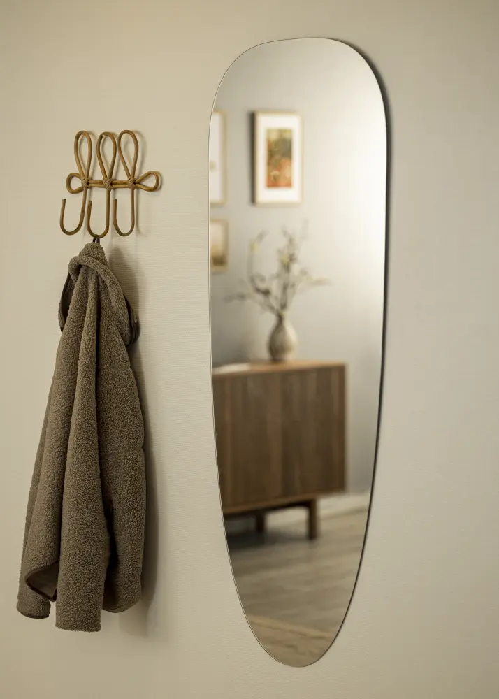 See peegel on loodud seisvalt riputamiseks, muutes selle ideaalseks kitsamate seinte või kohtade jaoks, kus horisontaalne ruum on piiratud. Selle voolav ja orgaaniline kuju loob ruumis pehme ja kutsuva atmosfääri, olles samas praktiline ja dekoratiivne komponent. Peegli disain on hoolikalt läbi mõeldud, et sulanduda erinevatesse sisustusstiilidesse, alates minimalistlikust kuni traditsioonilisemani.
