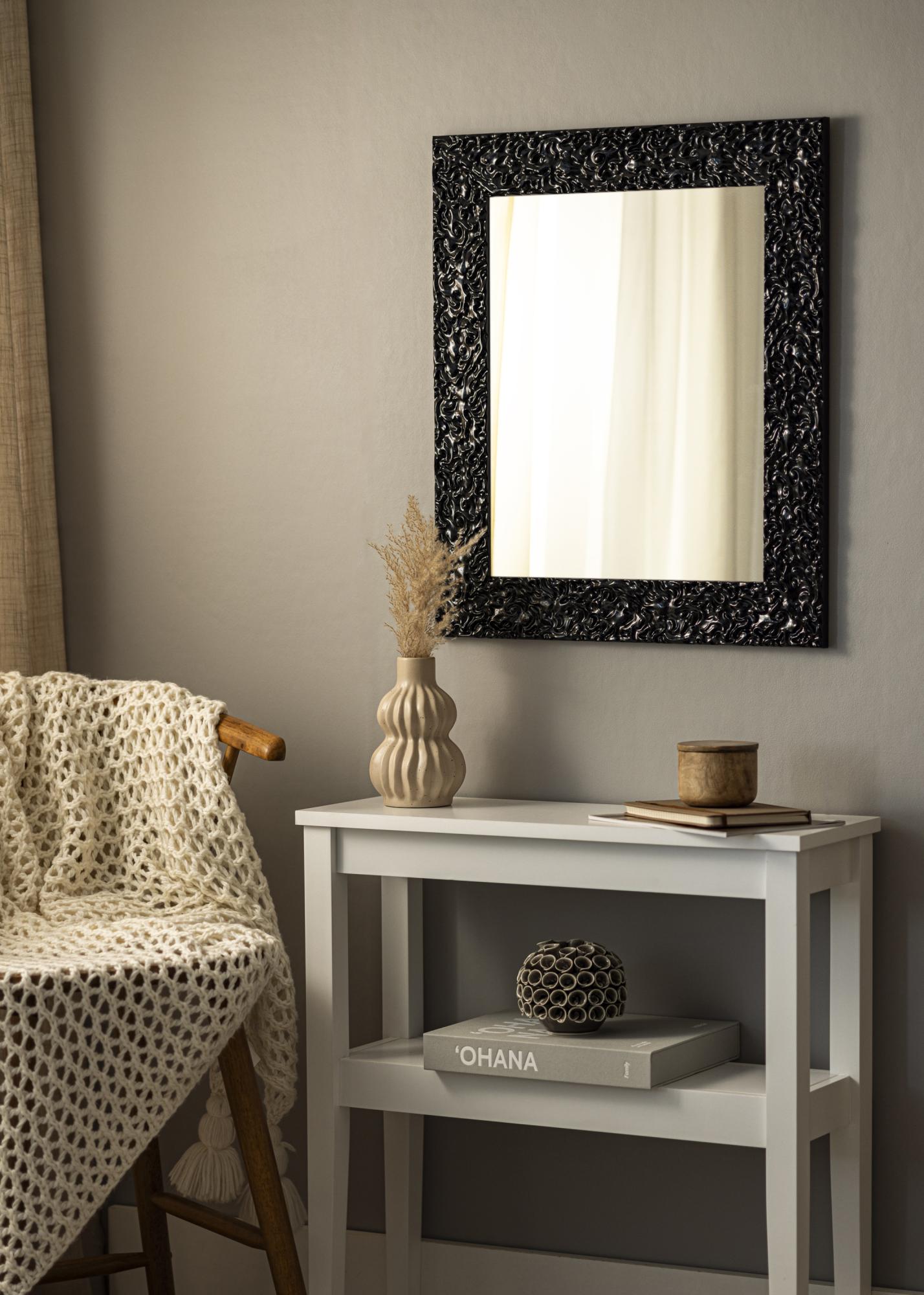 Peegel Westminster Must on eritellimusel valmistatud peegel, mille valmistame meie, mis tähendab, et saate selle täpselt teie kodusse sobivates mõõtmetes. Oma sügava musta värvi ja kõrgläikega pinnaga on see peegel elegantne täiendus igasse ruumi. 81 mm laiune raamiliist annab peegli tugevale raamistusele, samas kui orgaaniline muster pinnal loob elava ja dramaatilise efekti.