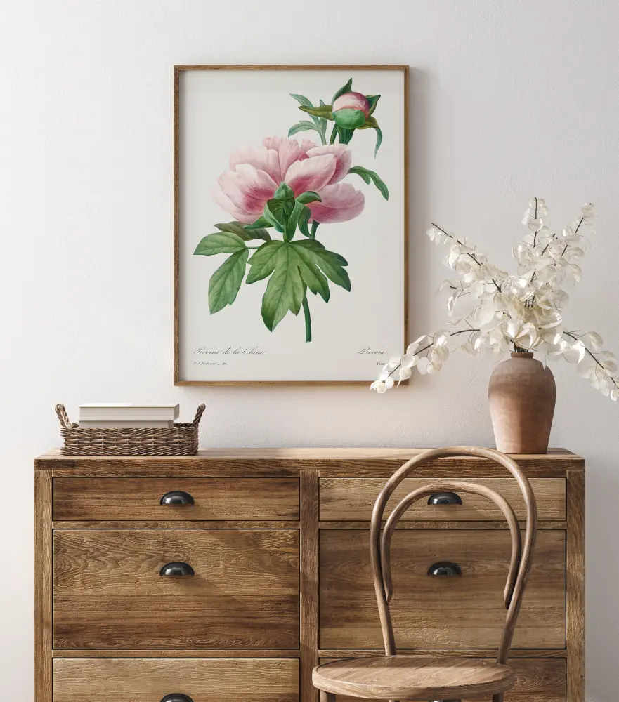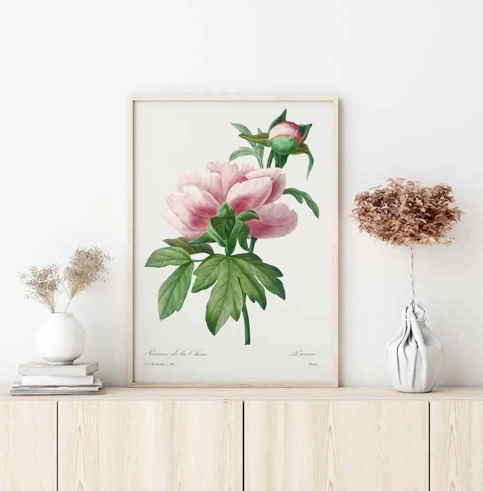 Kunstiposter pojengivarte ja roosa lillega. Beežika tausta peal on roosa lill asetatud virsikuvärvilise kujundi peale, samal ajal kui lehed on mustaga skitseeritud. Too selle lille õrnus oma koju.