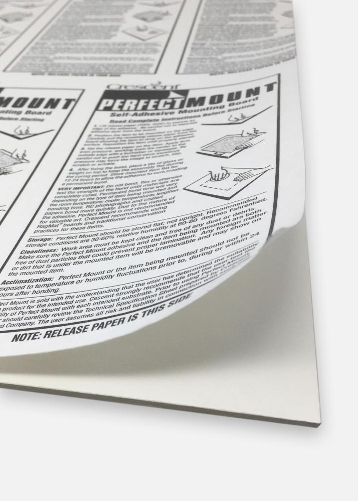 Perfect Mount on 1,4 millimeetri paksune paigaldusplaat, millel on kahepoolne liim piltide ja fotode paigaldamiseks. Plaat on loomulikult happevaba ja pH-neutraalne, et tagada parim võimalik teie piltide säilitamine. Plaadi liim aktiveeritakse survega, mis tähendab, et saate pilti paika panna ja eemaldada, kuni olete rahul. Võimalike mullide eemaldamiseks võib pildi pinnalt keskelt väljapoole siluda pehme riide või puuvillase kindaga. Seejärel asetatakse plaat surve alla, et pilt jäädavalt kinnitada.