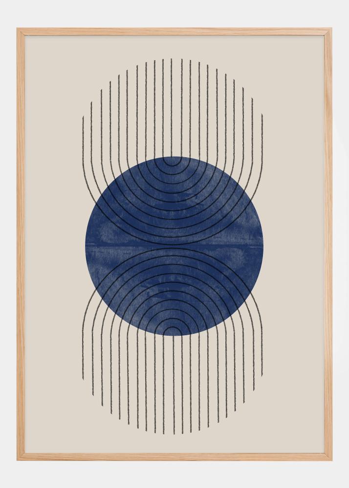 Selle minimalistlik ja abstraktne poster kujutab sügavsinist ringikujulist vormi, mis on joondatud mitmete vertikaalsete joonte sees, luues liikumise ja dimensiooni illusiooni. Kunstiteos mängib perspektiivi ja sügavuse optilise kogemusega korduva mustri kaudu, mistõttu sinine ring näib pulseerivat või vibreerivat. Karskete värvide skaala koosneb sügavsinisest neutraalsel taustal, mis rõhutab disaini puhtaid jooni ja lihtsat ilu.