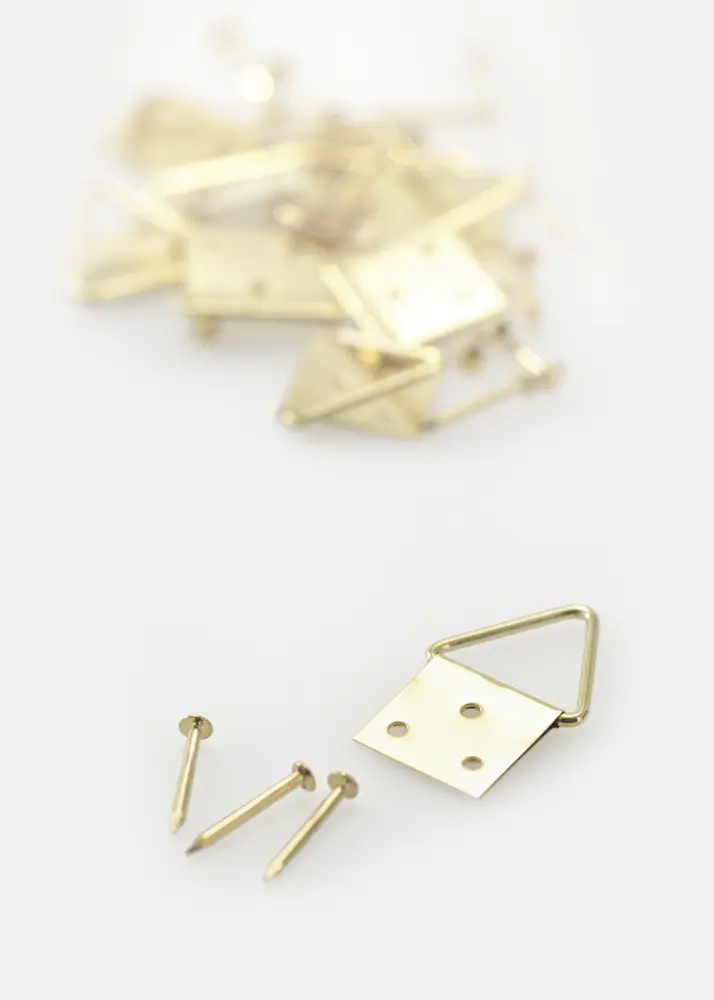 Kolmnurkne riputuskonks messingist. Naelutatakse raami tagaküljele. Saab kasutada ühe või kahe konksuna, kui soovite kasutada pildilõnga. See konks sobib suurematele maalidele (maksimaalsed mõõtmed: 60x90 cm)