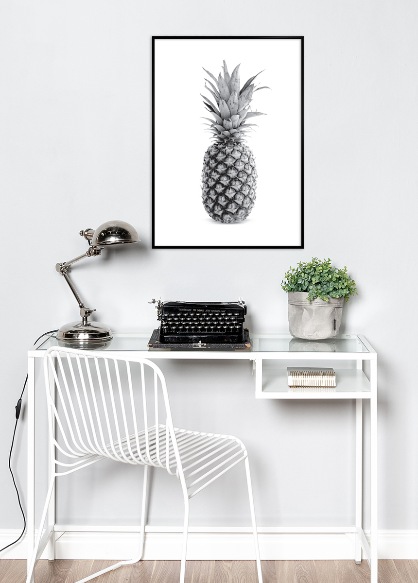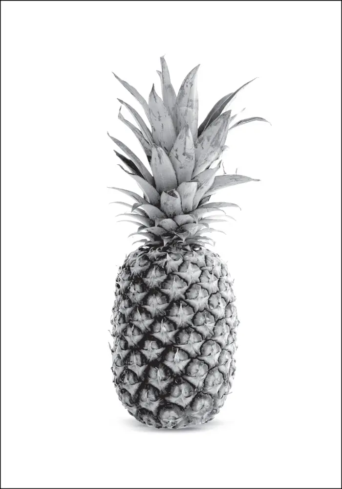 Plakat sisekujunduse huvilise lemmikpuuviljaga – ananassiga, ideaalne sellele, kes tahab olla teadlik disainist ilma pidevalt uusi puuvilju ostmata. Mustvalge kujutis sobib igasse sisustusstiili ja ruumi kodus, samas on see suurepärane ka avalikus keskkonnas. Täienda õhukese ühevärvilise pildiraamiga, mis ei konkureeri motiiviga ja mis sobib keskkonda, kus pilt üles riputatakse.