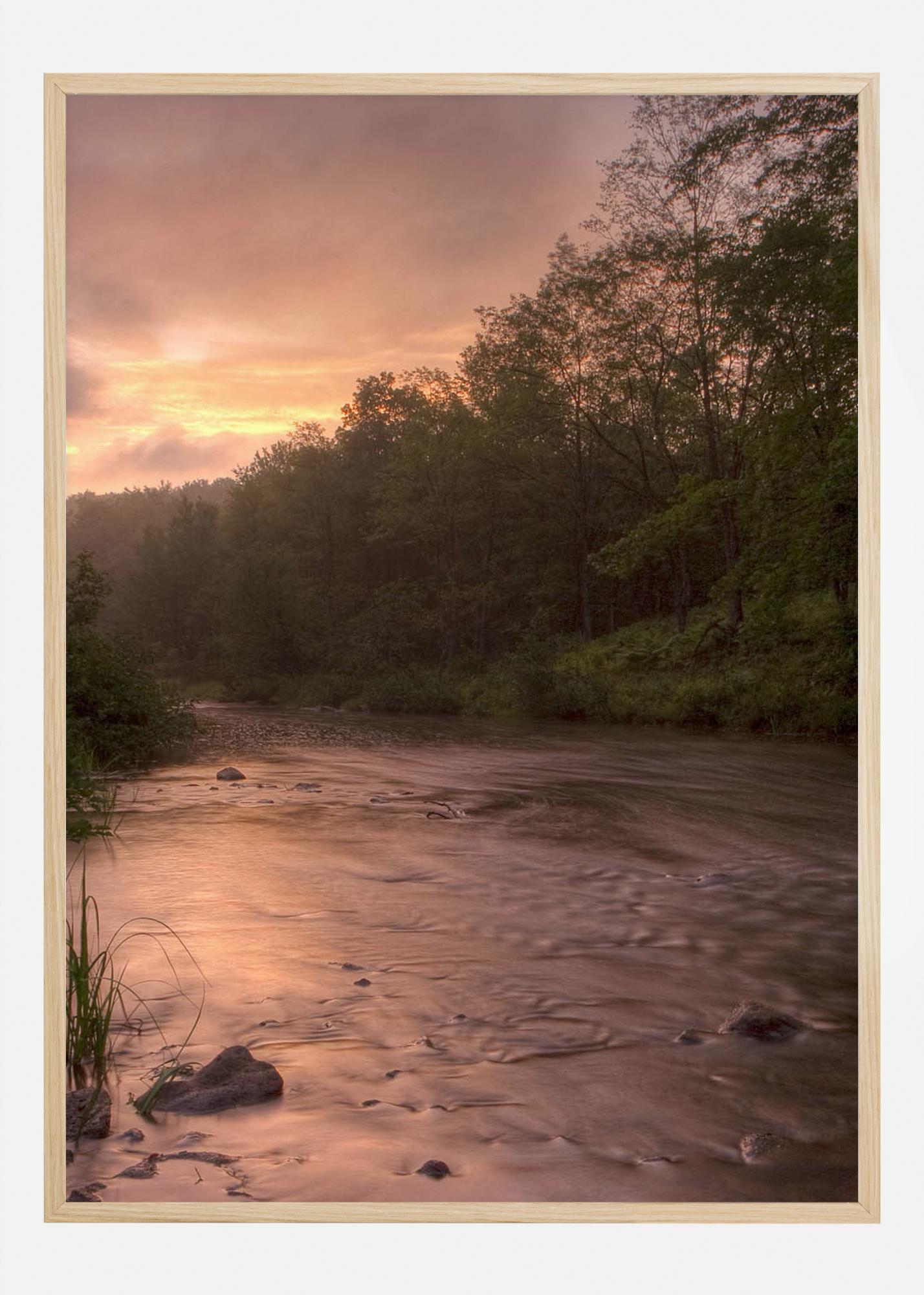 Imeline trükk mudasest jõest, mis voolab läbi metsa. Oranžikas õhtupäike vajub läbi pilvede, andes pildile peene oranži varjundi. Riputage see maagiline plakat elutuppa ja laske end vooluga kaasa viia.