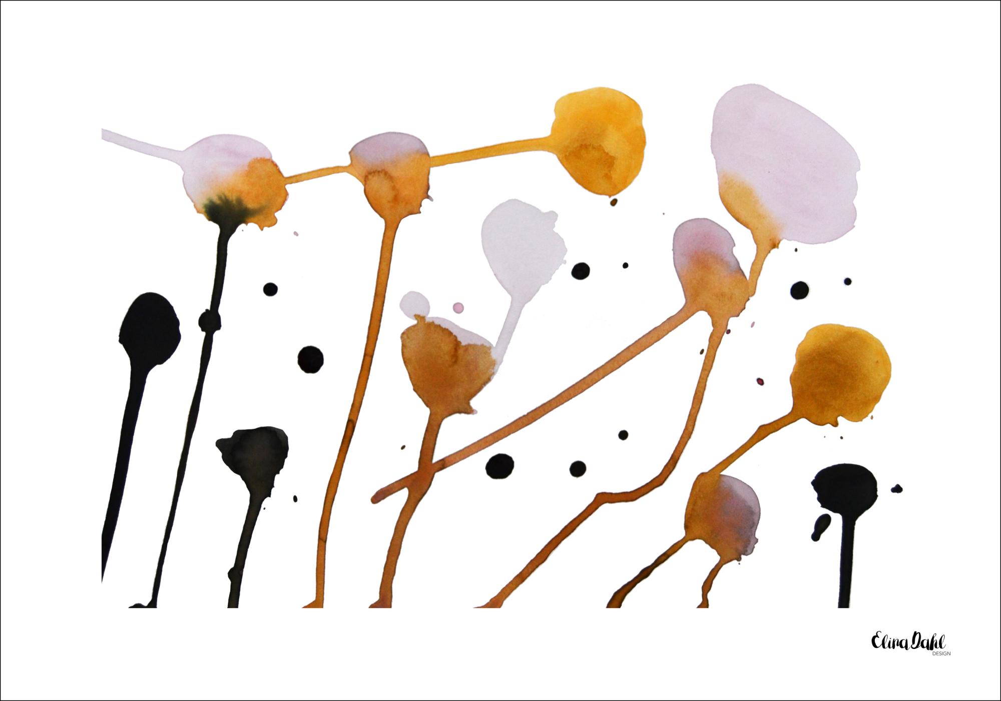 Botaaniline plakat oranžide, roosade ja mustade õievartetega. Valgele pinnale maalitud erinevat värvi õievarted on paigutatud juhuslikult ja vartide vahele on pritsitud musti täppe. Stiilse tunde loomiseks võid selle lisada neutraalsele seinale.