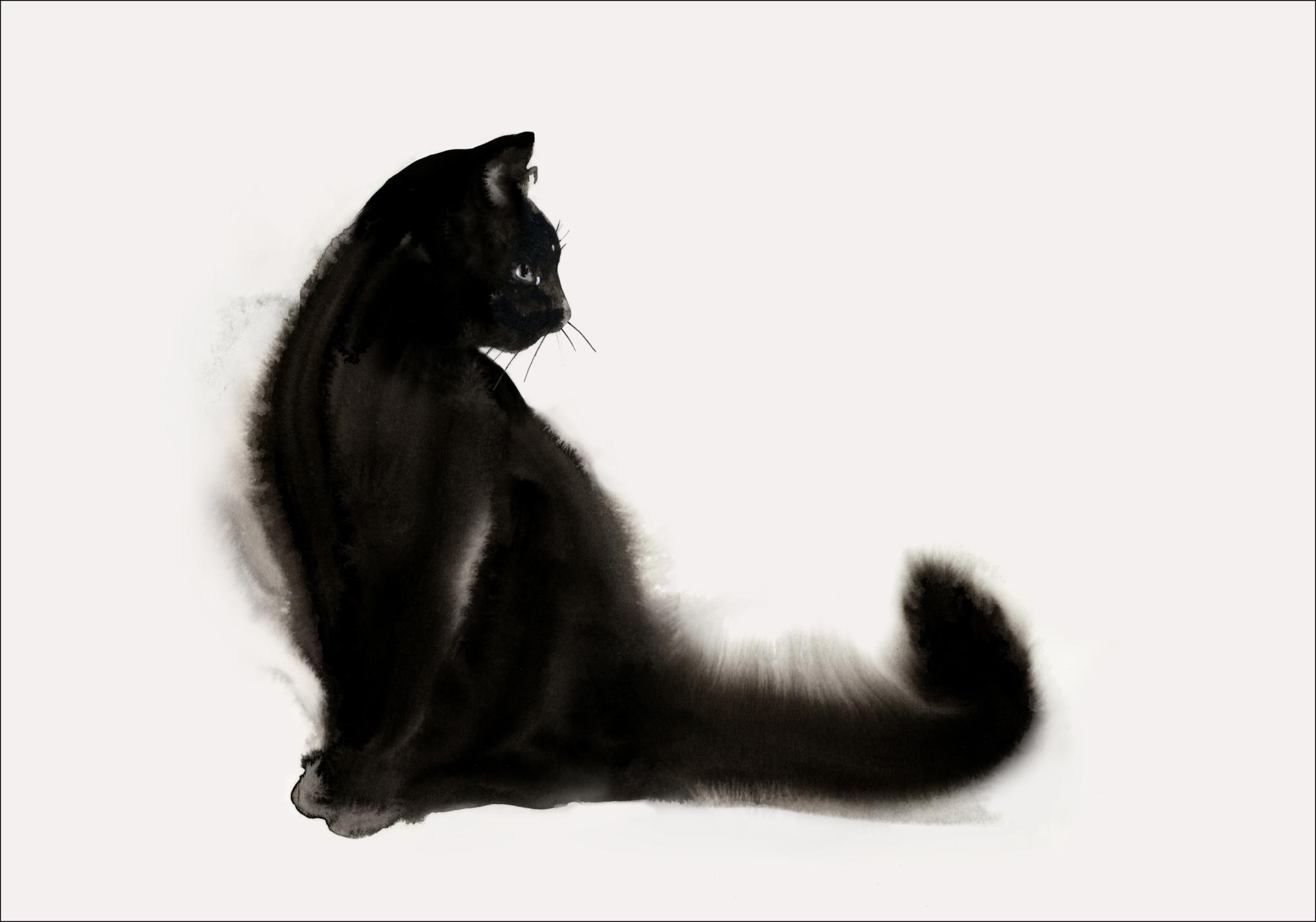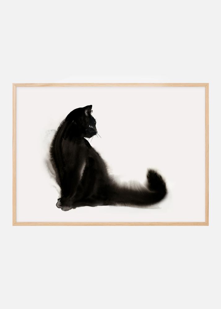 Kaunis musta Birma kassi trükis. Valgel taustal vaatab must kass üle õla, justkui jälgides midagi. Loomulik valgus paistab kassi esikäppadele, luues valge laigu. Suurepärane plakat kassihuvilistele.