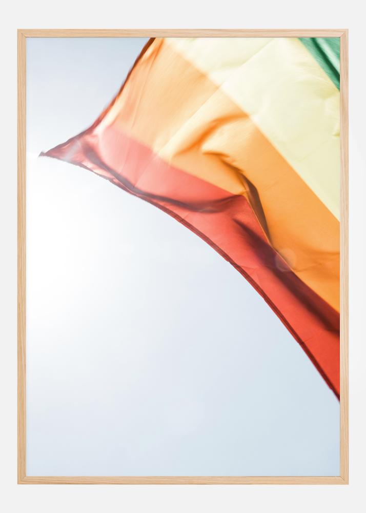 Sümboolne liputrükk hallil taustal. Paigutatud trüki ülemisse poolde, lehvib lipp õrnalt tuules. Lipu punased, oranžid, kollased ja rohelised triibud on horisontaalselt paigutatud. Värvikas poster, mis elavdab iga tühja seina.