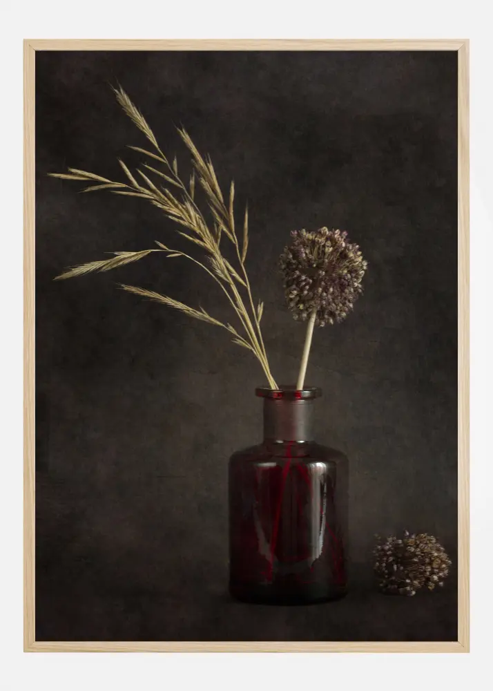 Kaunis, kuid lihtne trükk kahest kuivatatud rohust klaaspurgis. Tumedal pruunil taustal on kollased rohulibled asetatud punasesse purki. Vaasi paremal pool asub veel üks kuivatatud rohi. Ilus plakat, mis lisab valgele seinale veidi värvi.