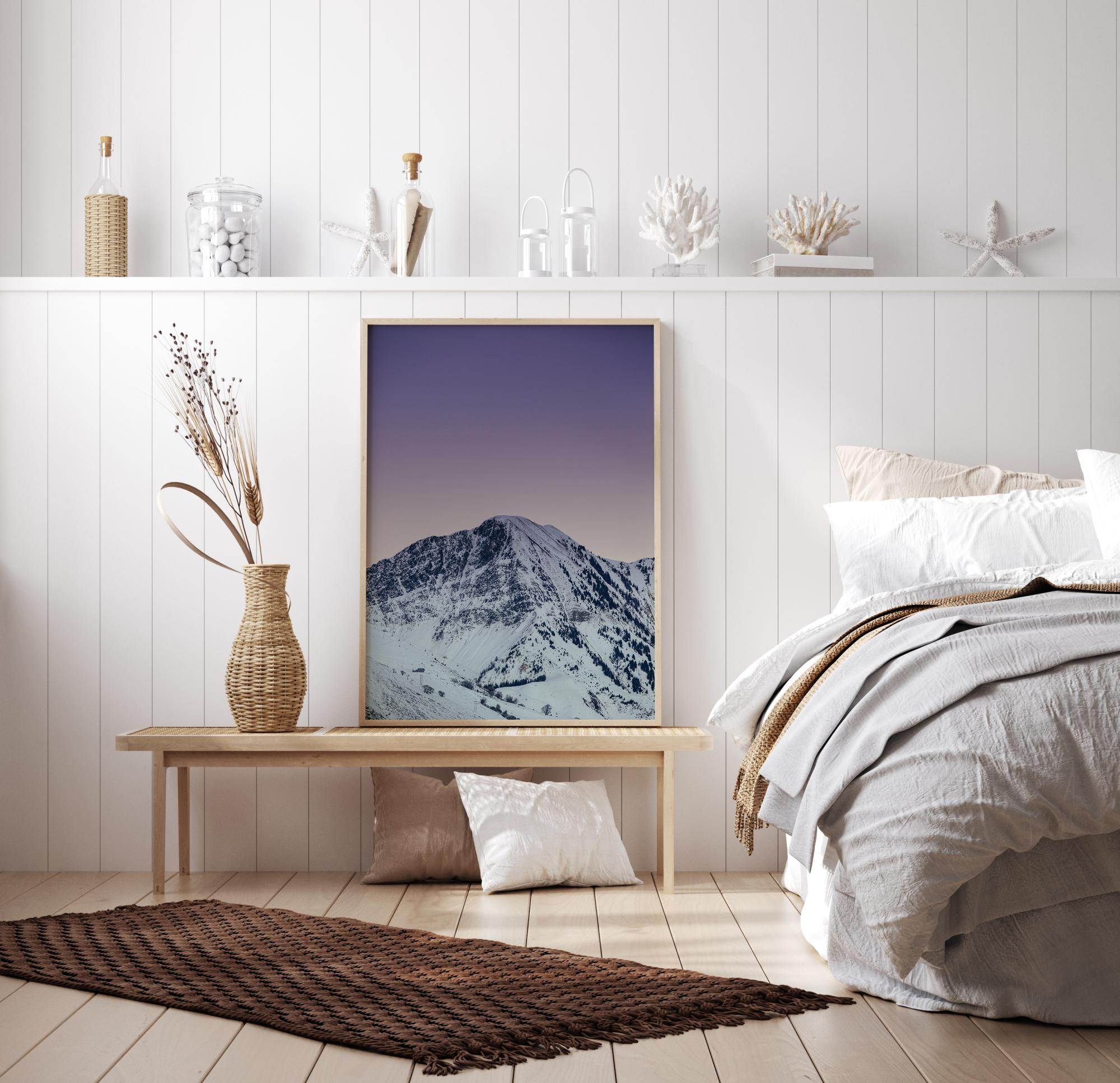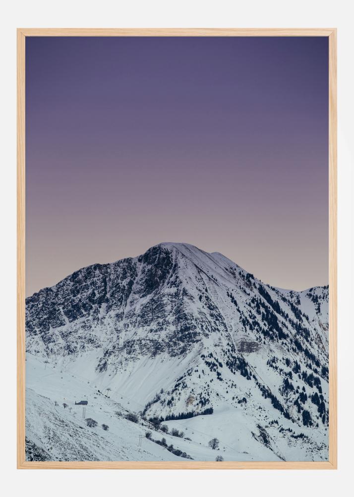 Tähistaeva öö poster massiivse valge mäe kohal. See muljetavaldav lumega kaetud mägi asub suurejoonelise lilla taeva all. Lilla taevas peegeldub mäetippudel, luues trükile sooja tunde. Kaunis pilt riputamiseks külmas keskkonnas.