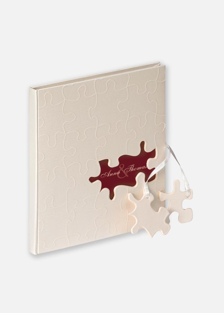 Külalisteraamat valgete ja punaste linase kangaga kaantega. Külalisteraamatu esiküljel on koht isikliku pildi või abielupaari nime jaoks. Saadaval on ka sobiv pulmaalbum sinu pulmapiltide jaoks.