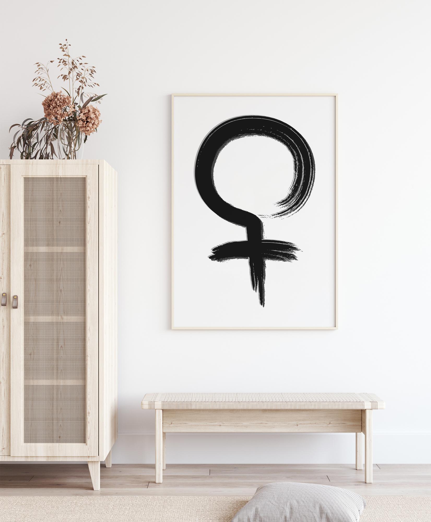 Lihtne mustvalge trükk, mis illustreerib naise sümbolit puuduliku ringiga. Valgel taustal must sümbol hajub ringi lõpu suunas. Täiuslik plakat naiselikku keskkonda riputamiseks.