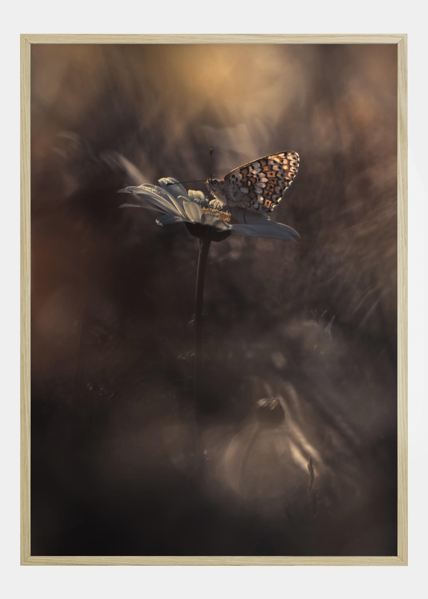 Ideaalne lähivõtteprint oranžist liblikast, mis istub ühelainsal varrel kasvaval karikakral. Pehme pastelsetel taustal toovad hägused värvid esile kauni ja õrna õie ning liblika. Hingetuksvõttev plakat, mida riputada kamina kohale.