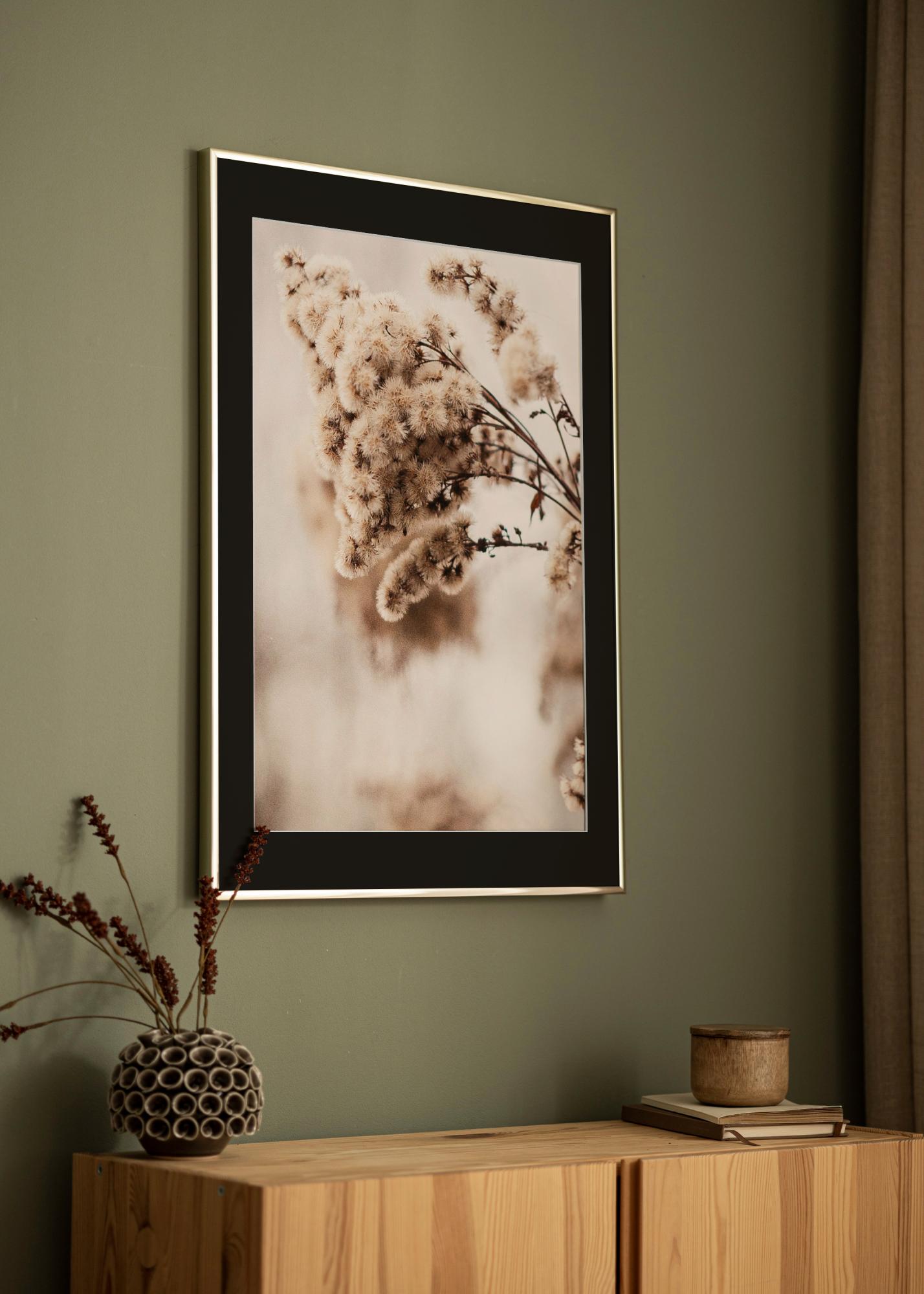 Raam on läikiv ja peegeldab valgust peenelt, suurendades kontrasti musta passepartou vastu. See loob dramaatilise raamimise ja tõmbab pilgu motiivile.