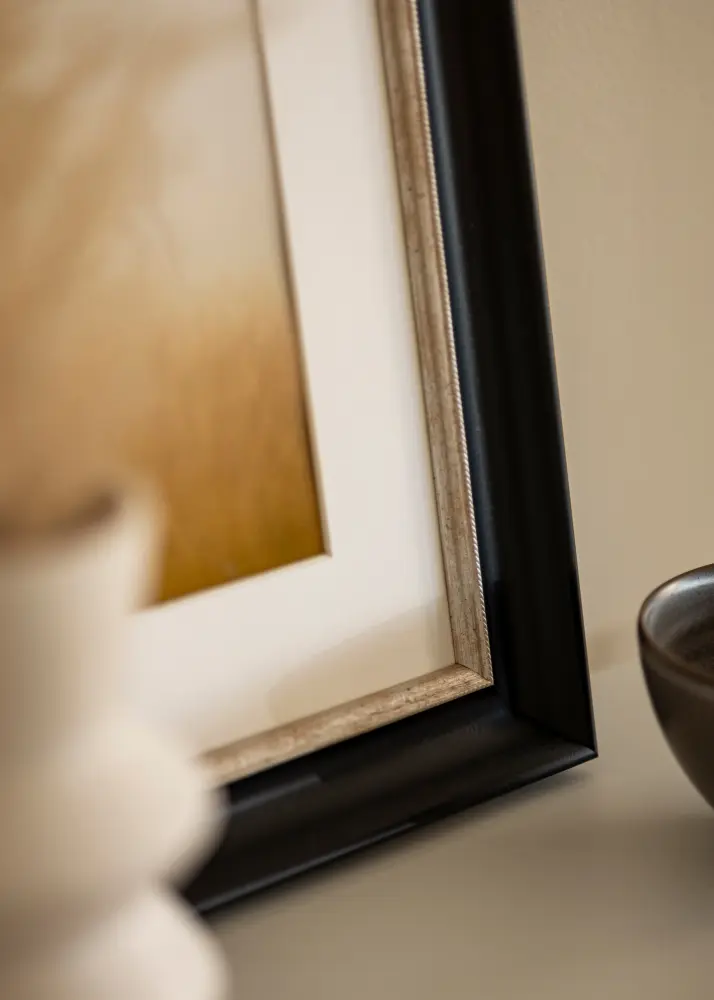 Luksuslik pildiraam vabalt valitavas suuruses musta klassikalise profiiliga. Motiivile kõige lähemal on elegantne hõbedane ääris, mis annab raamile lisasära.