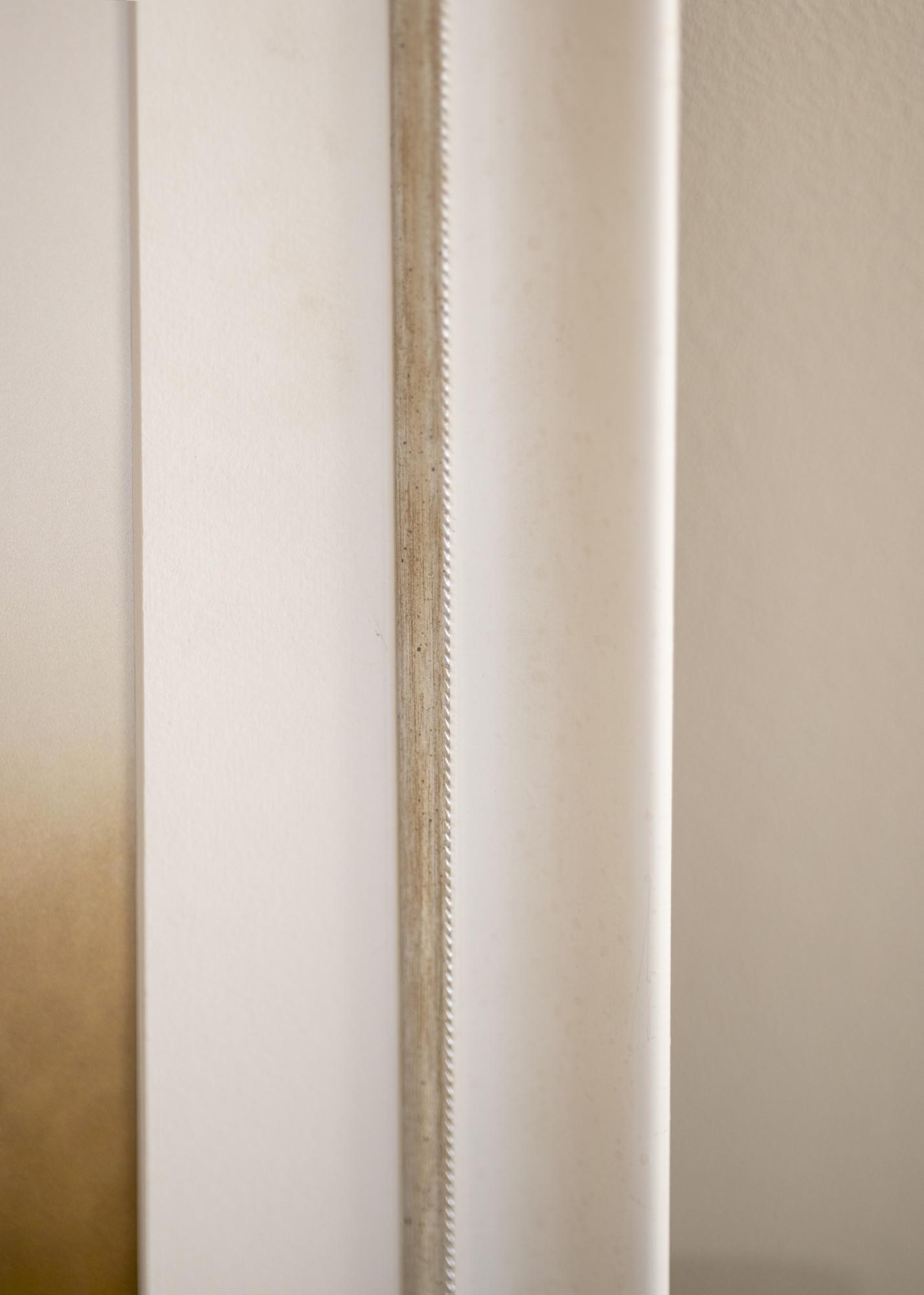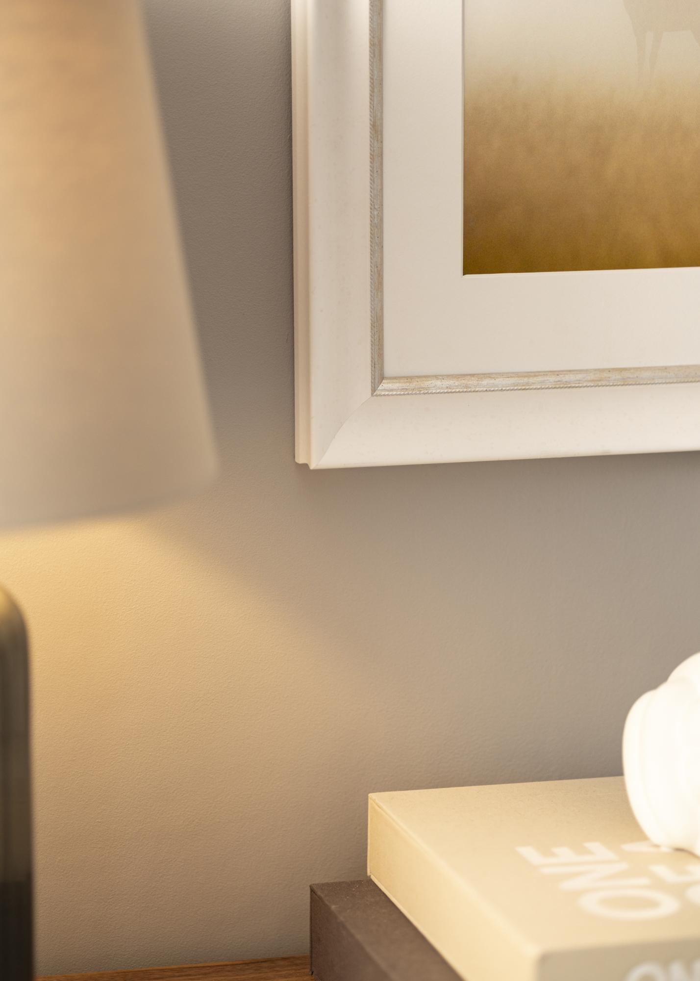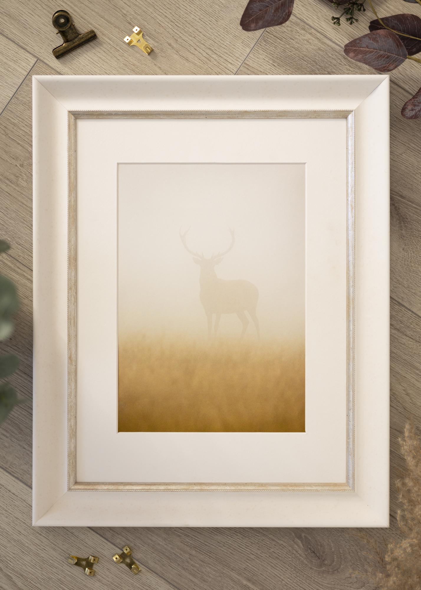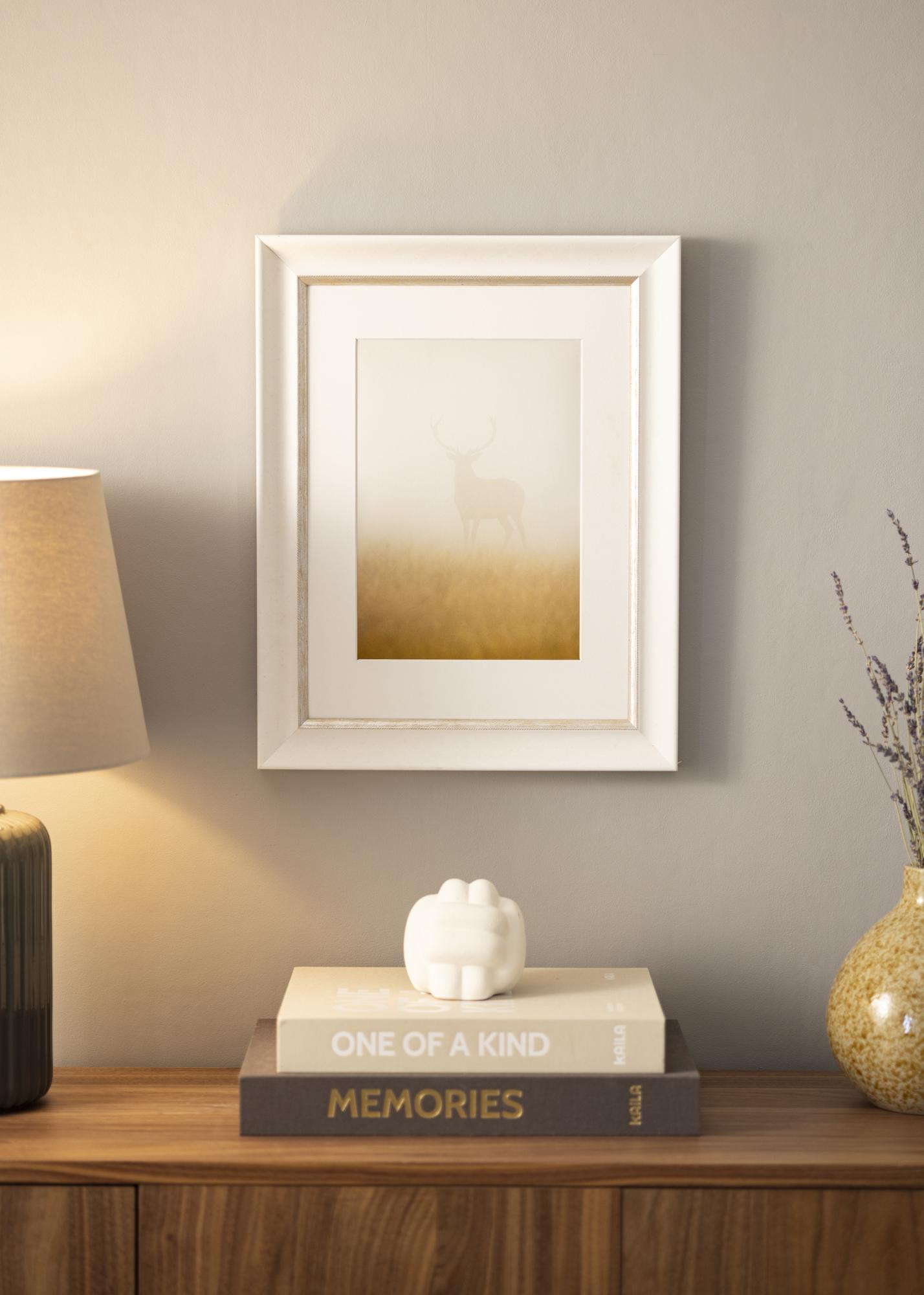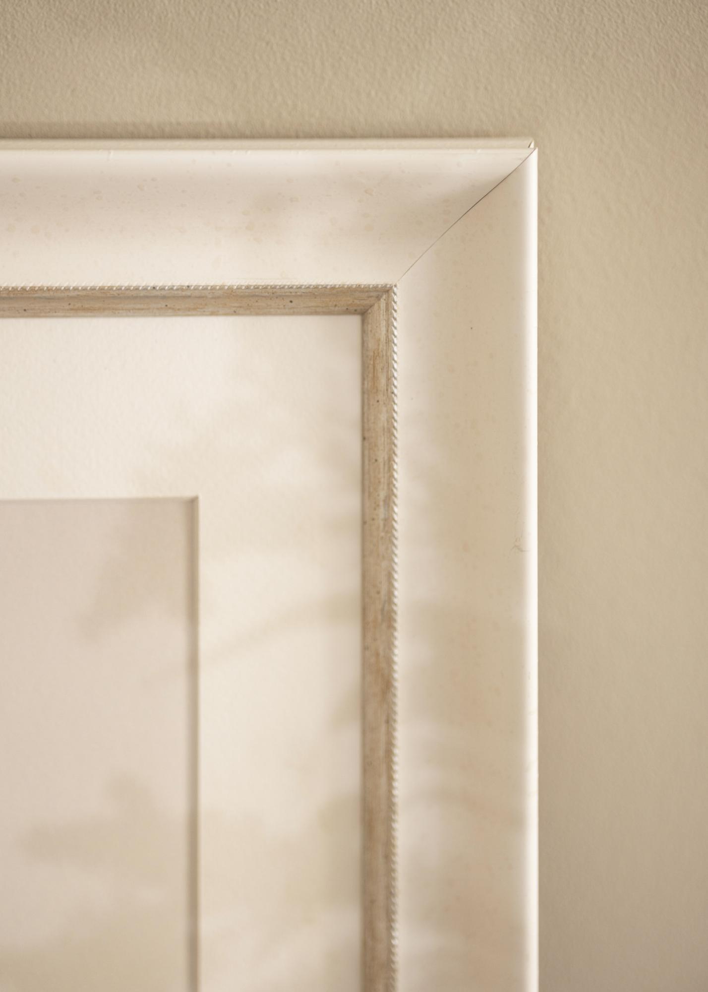 Tugev raam mis tahes suuruses, klassikalise valge profiiliga. Pildi lähedal on elegantne hõbedane ääris, mis annab raamile lisasära.