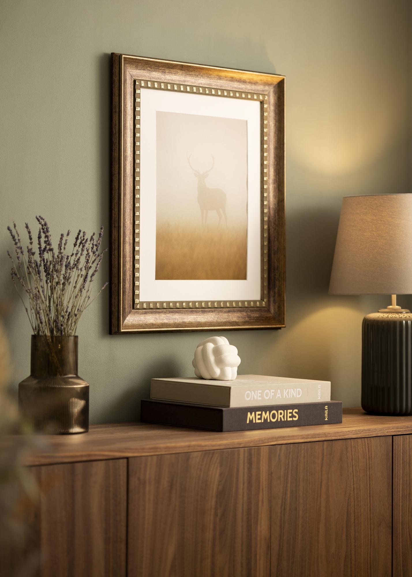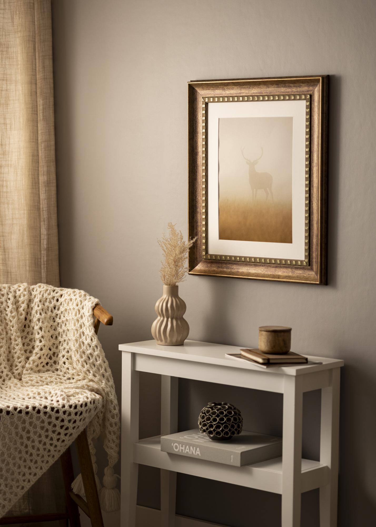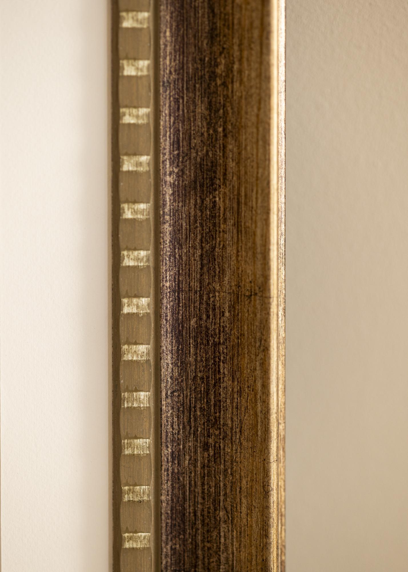 Camden Silveril on soe pruun värv koos peene antiikviimistlusega, mis annab sellele rustikaalse iseloomu. Pind on kaetud kergelt sooniliste detailidega, mis jäljendavad naturaalset puitu ja tugevdavad vintage-välimust. Dekoratiivne sisemine serv on kaunistatud väikeste, regulaarsete kuldse värviga detailidega, mis loovad elegantse kontrasti tumedama puidutooniga. Välimisel serval on õrn kaldserv koos diskreetse kuldviimistlusega, mis annab pildiraamile luksusliku ja ajatu tunde.