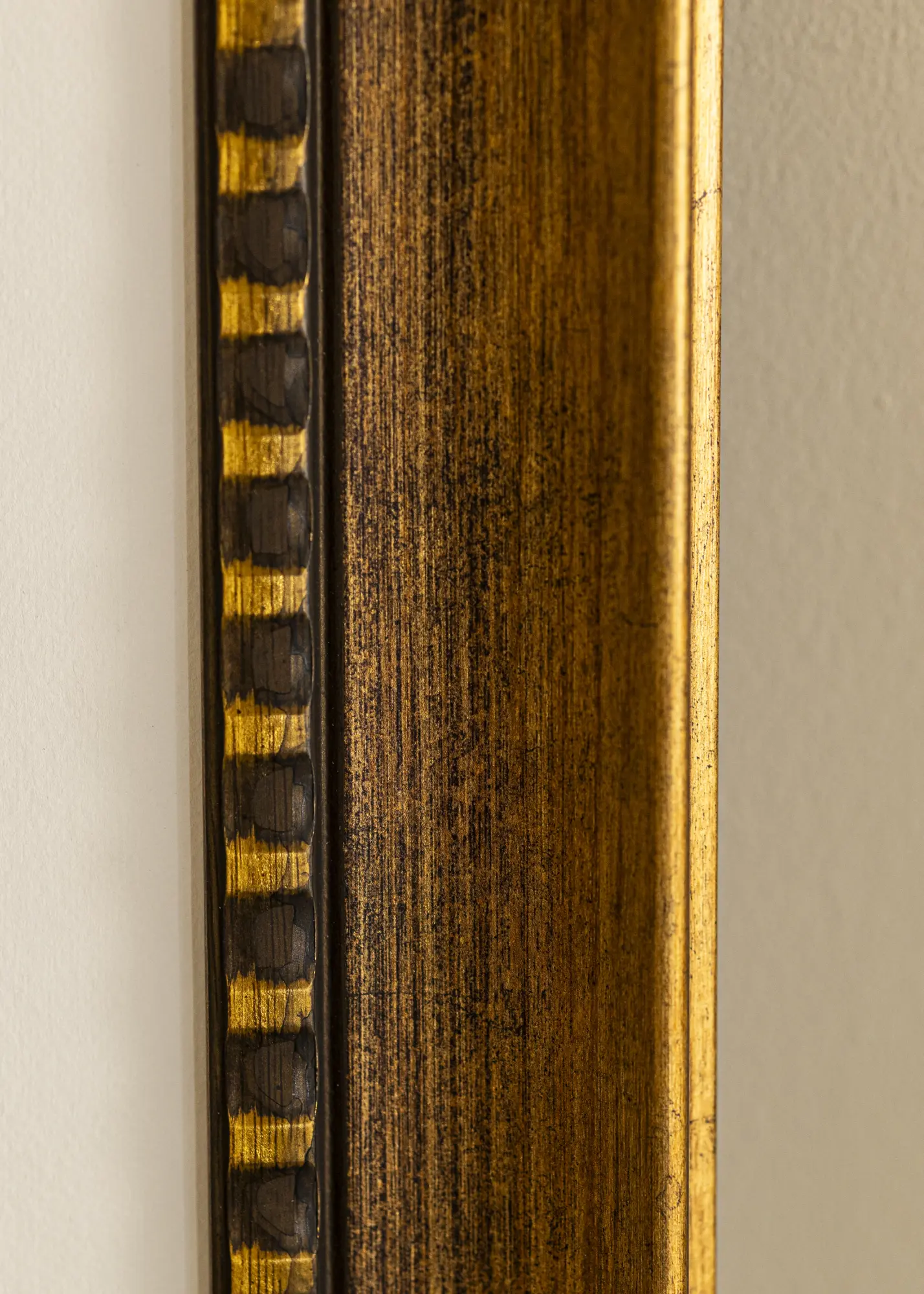 75 mm laiune raamilatt omab peent läikivust ja on kaunistatud erilise triibulise detailiga kullas ja mustas mööda sisemist serva. See annab raamile ainulaadse karakteri ja muudab selle ideaalseks klassikaliste ja traditsiooniliste kunstiteoste esiletoomiseks. Puidustruktuur on nähtav ja lisab maalähedase tunde, samas kui pehme kuldne äär lisab elegantsi.