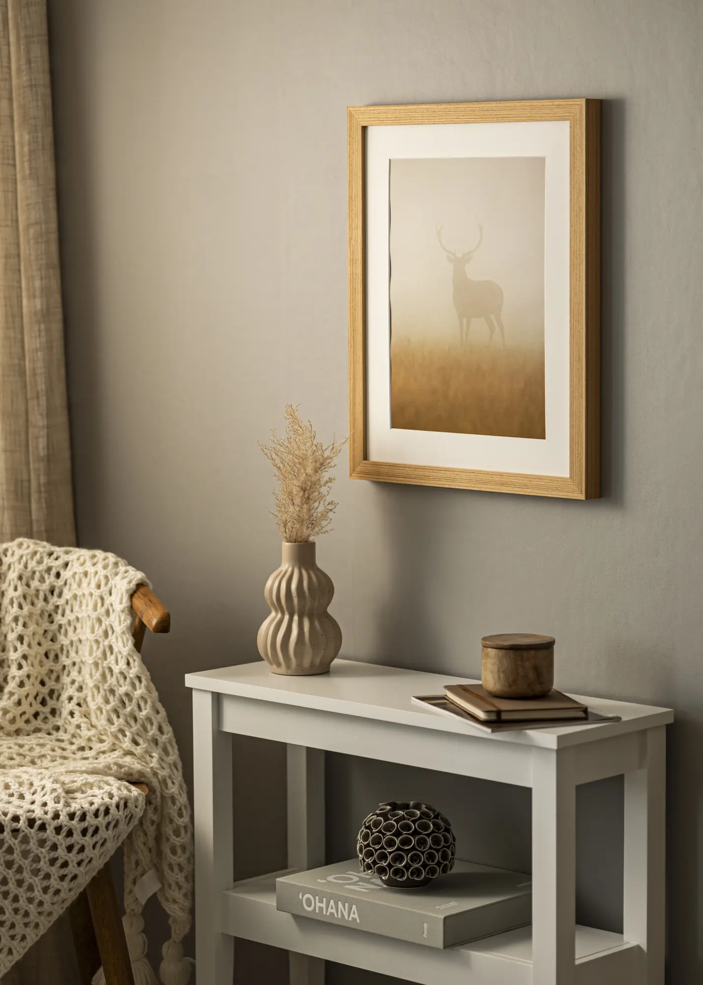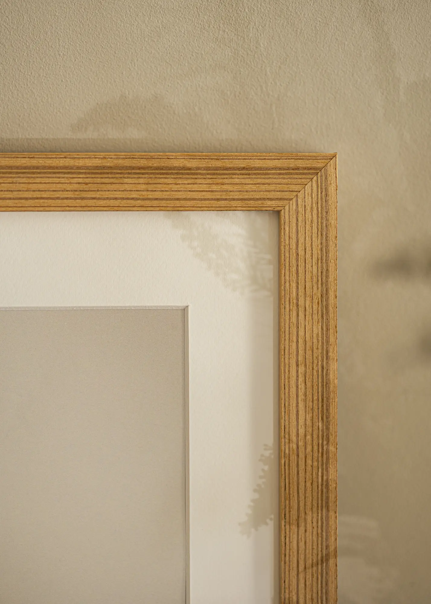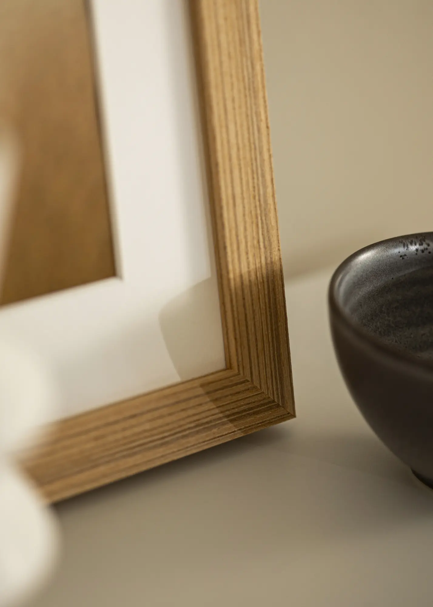 Raamil on 28 mm laiune ribalaius ja sügavus 33 mm, mis annab sellele tugeva ja stabiilse tunde. Tugev struktuur ja vooderdatud pind loovad elava sügavuse, mis annab teie kunstiteosele või fotole taktiilse mõõtme. Matt viimistlus toob esile tamme loomulikud muutlikkused ilma peegeldusefekte tekitamata, muutes selle ideaalseks motiivi esiletoomiseks ilma häireteta.