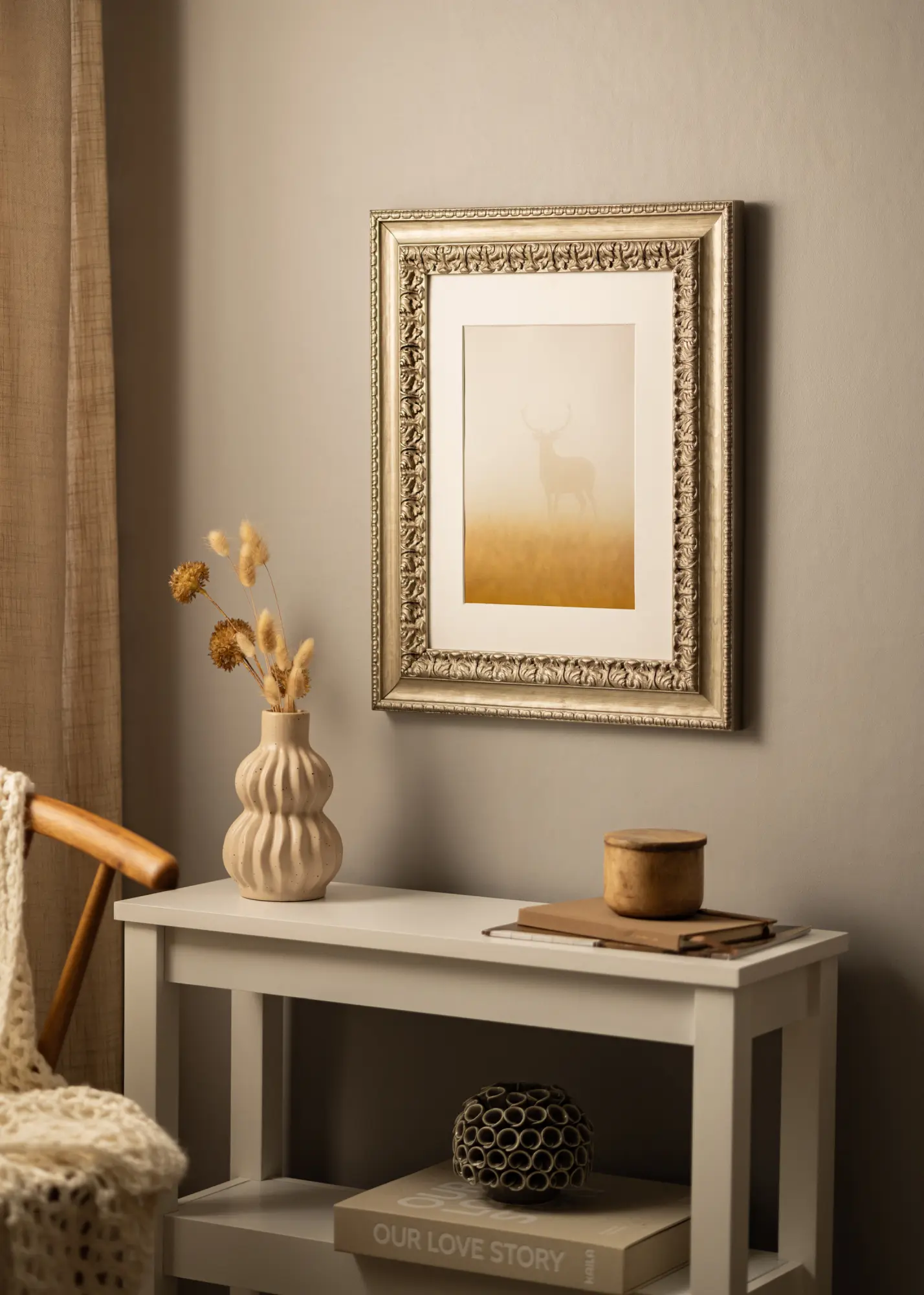 Raam Drottningholm Silver III on elegantne pildiraam, mis pakub keerukat raamimist teie kõige armastatumatele fotodele ja kunstiteostele. Oma kauni hõbedase värvi ja 68 mm laiuse raamilistiga jätab see raampilt muljetavaldava mulje igas toas, kuhu see asetatakse. Raami sügavus 30 mm annab sellele robustse tunde ja teeb sellest stabiilse valiku nii väikeste kui ka suurte teoste jaoks.