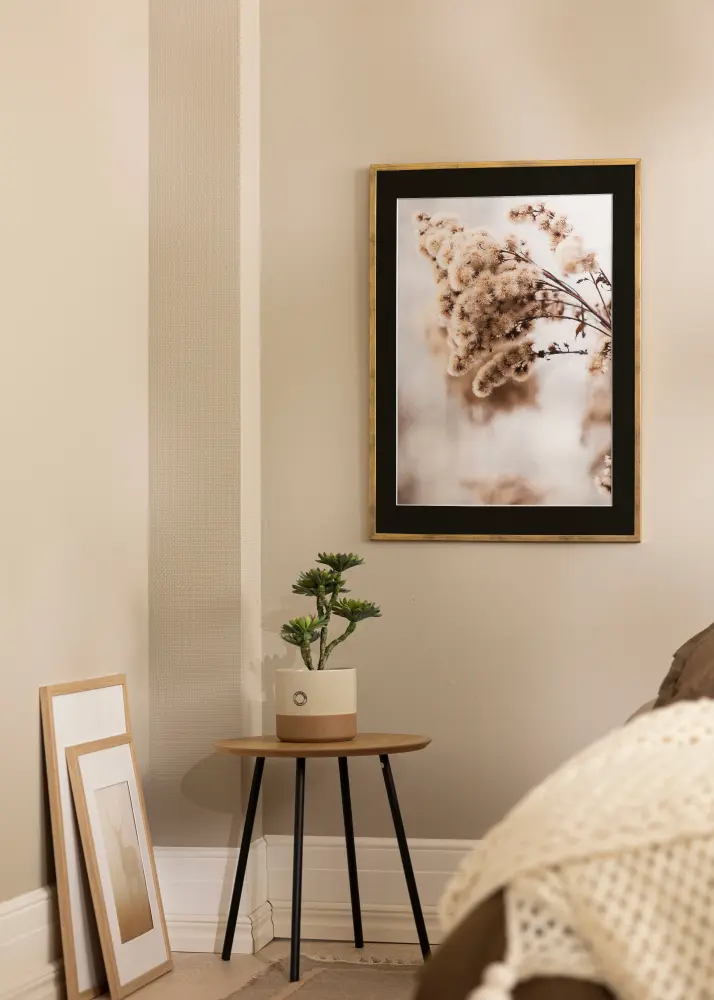 Koge elegantsi ja rafineeritust meie eksklusiivse kullaraamiga, mis sobib ideaalselt sinu A2-pildi (42x59,4 cm) stiilseks esiletoomiseks. Must passepartout pakub sügavat ja kontrastset raamimist, mis rõhutab sinu kunstiteost või fotot professionaalsel viisil.