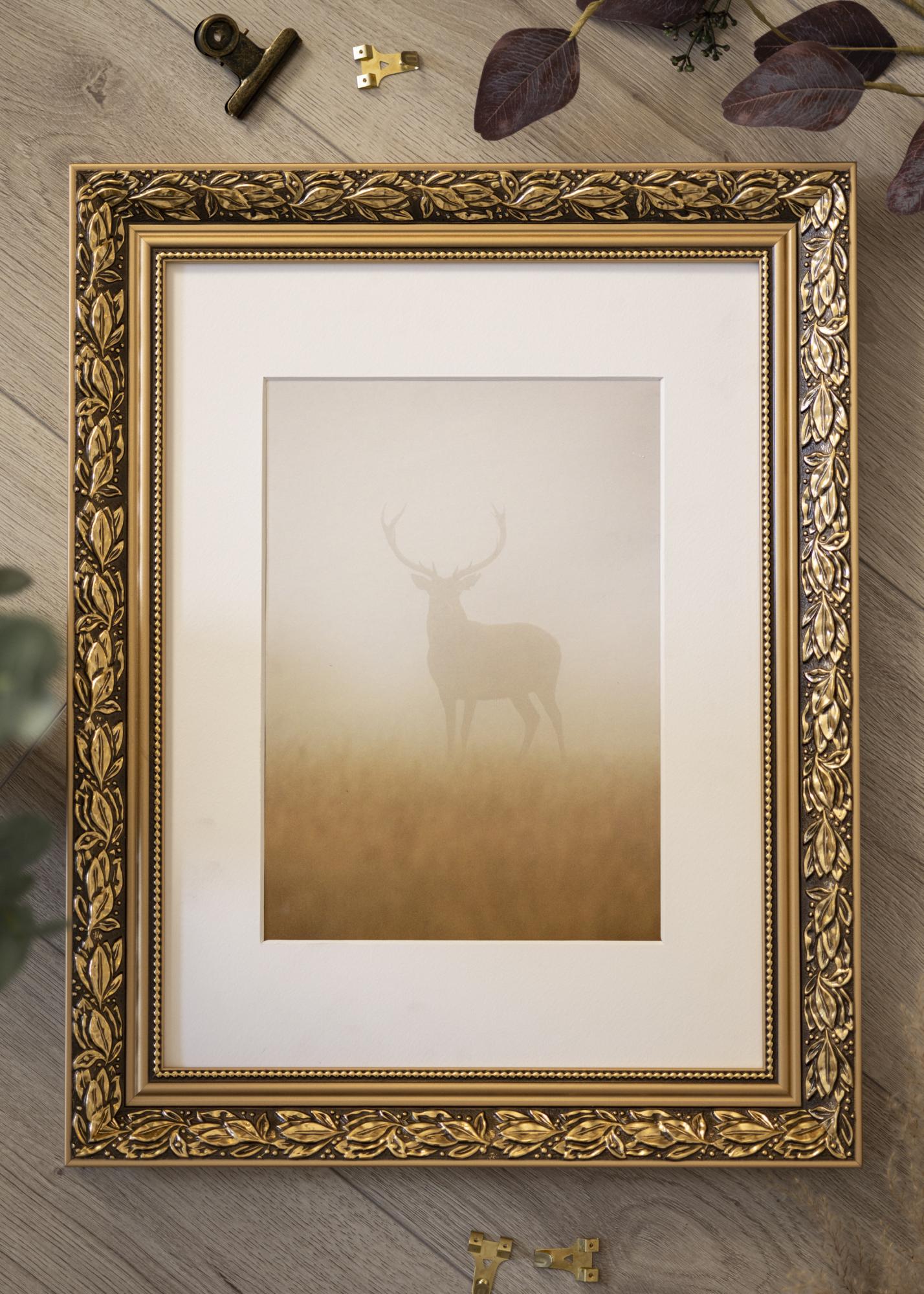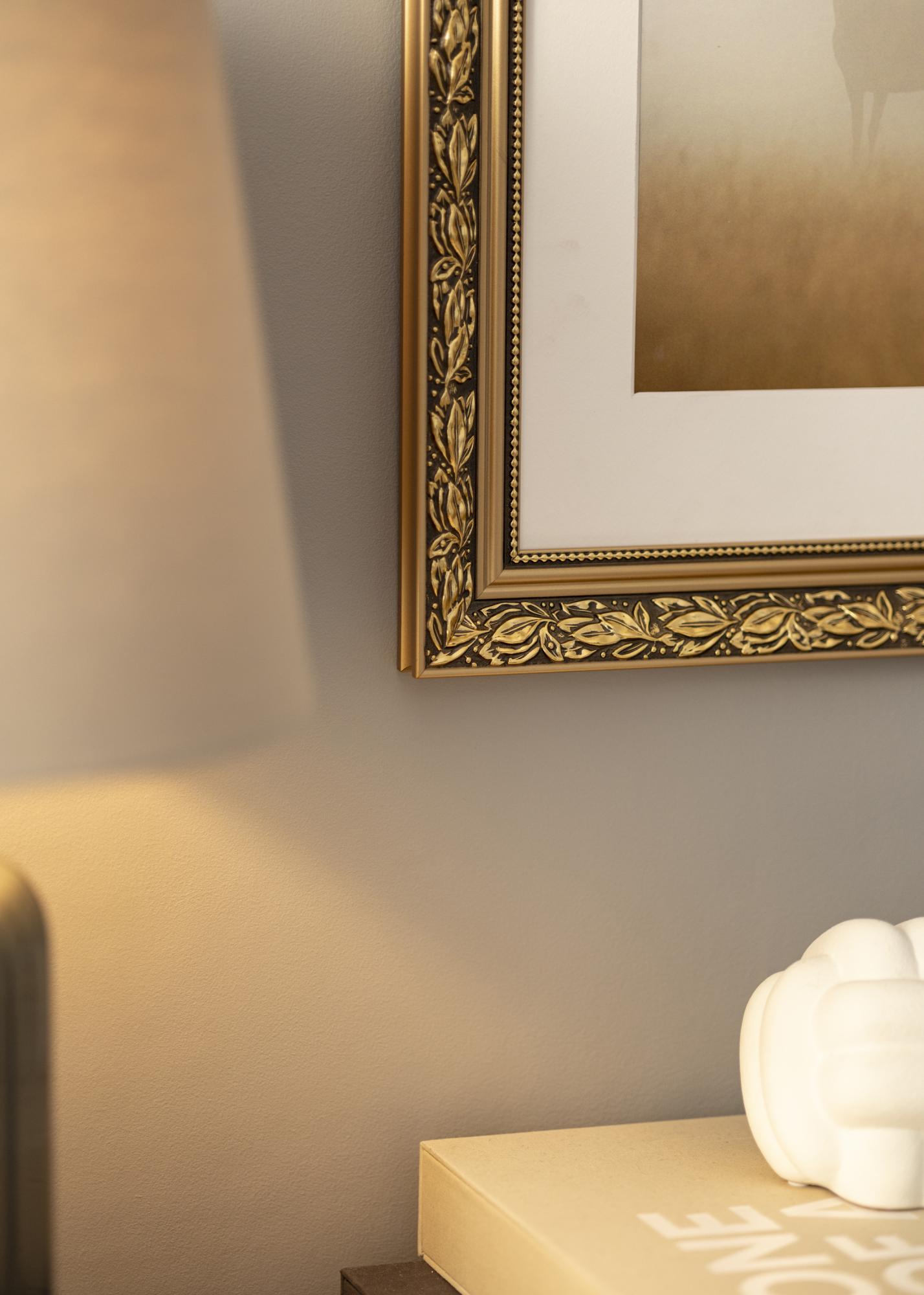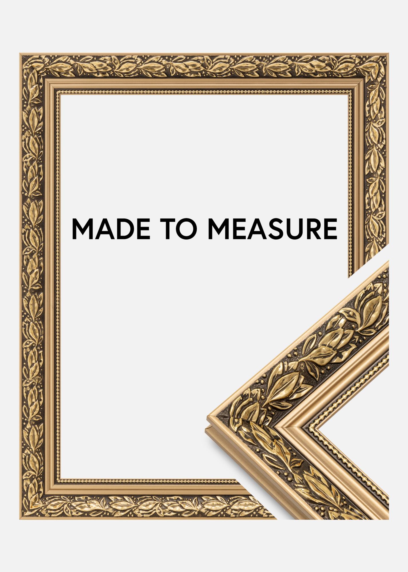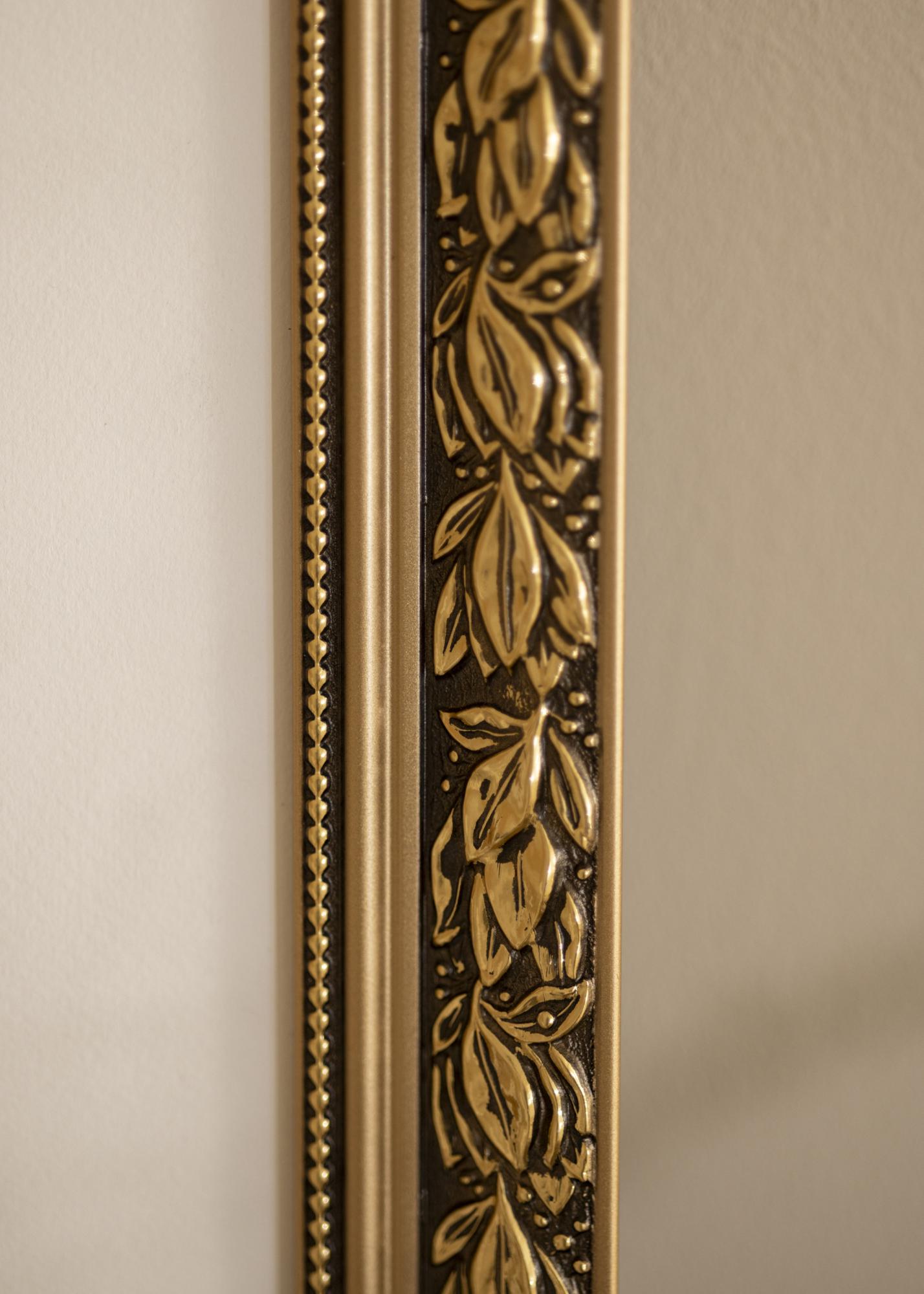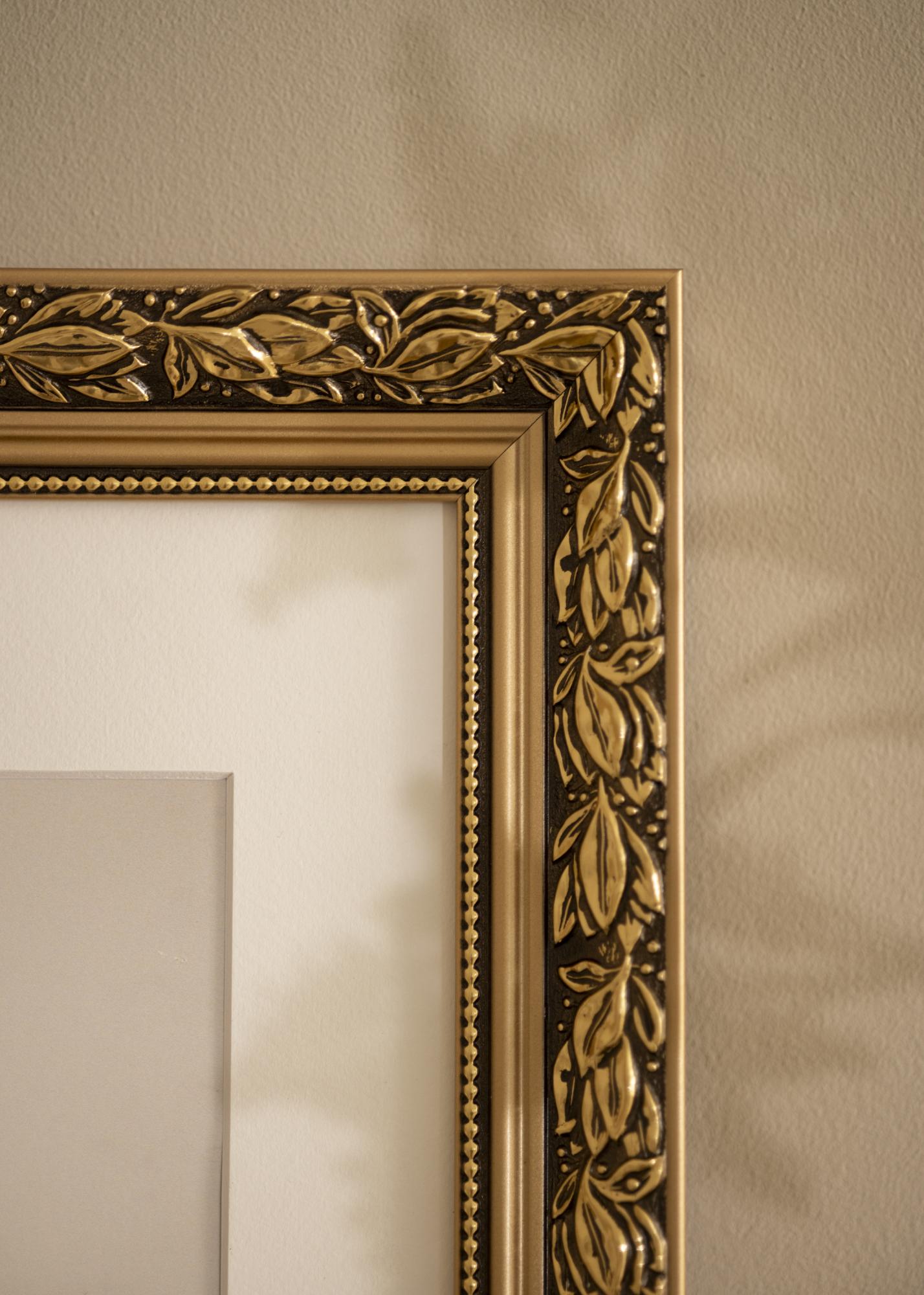 Kallis pilt väärib kaunist raami! Siin on meil romantiliselt kujundatud pildiraam kullavärvi äärtega, keeruliste lehemustritega kuldpruunil taustal ja armas kuldlint pärlikujuliste mustritega klaasi ääres. Kasuta seda vanale mustvalgele fotole, mille oled pärinud või loo põnev kontrast uue pildiga. Kuna raam valmistatakse sinu mõõtude järgi, võid olla kindel, et see sobib täpselt sinna, kuhu soovid!
