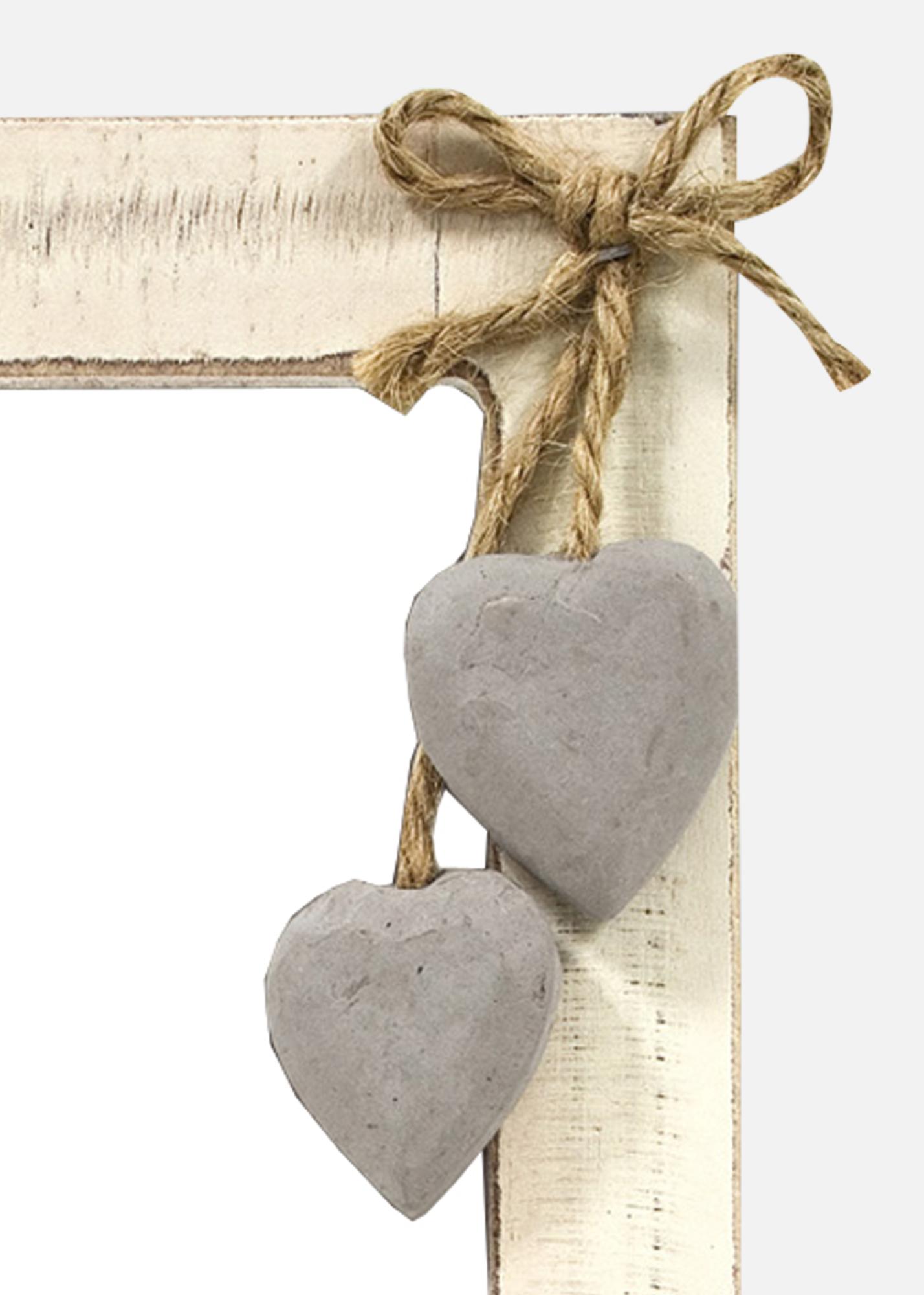 Metz on kreemikas vintage-raam, mis annab kulunud ja käsitsimaalitud mulje. Raamil on disain, mis keskendub armsatele detailidele või kuidas sulle meeldivad väikesed nunnud südamed, mis ripuvad kanepinööril? Vintage ja romantika parimal kujul!