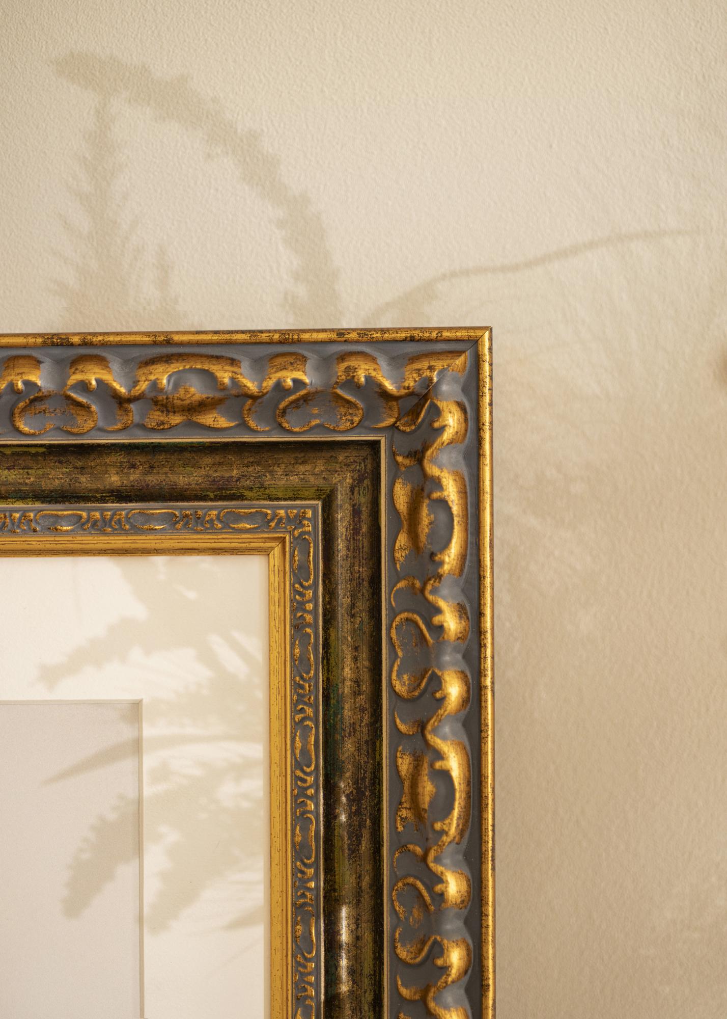 Kas soovite koostada kauni maali vana sugulase foto või pere ilusa pildiga? Siin on meil luksuslik raam, mis lisab iseloomu ja tõmbab tähelepanu! Raam on ilusa kulunud mustriga, mis vaheldub kuldse ja halli, samuti kuldse, rohelise ja pruuni vahel. Kuna see on valmistatud meie enda raamitöökojas, võite olla kindel, et saate kvaliteetse pildiraami.