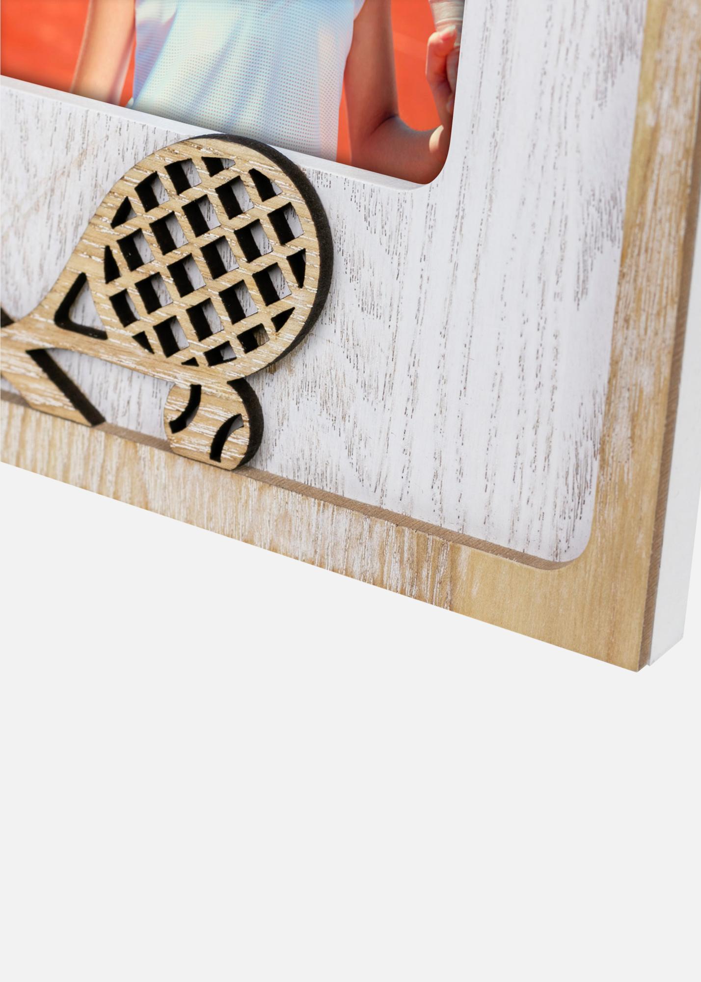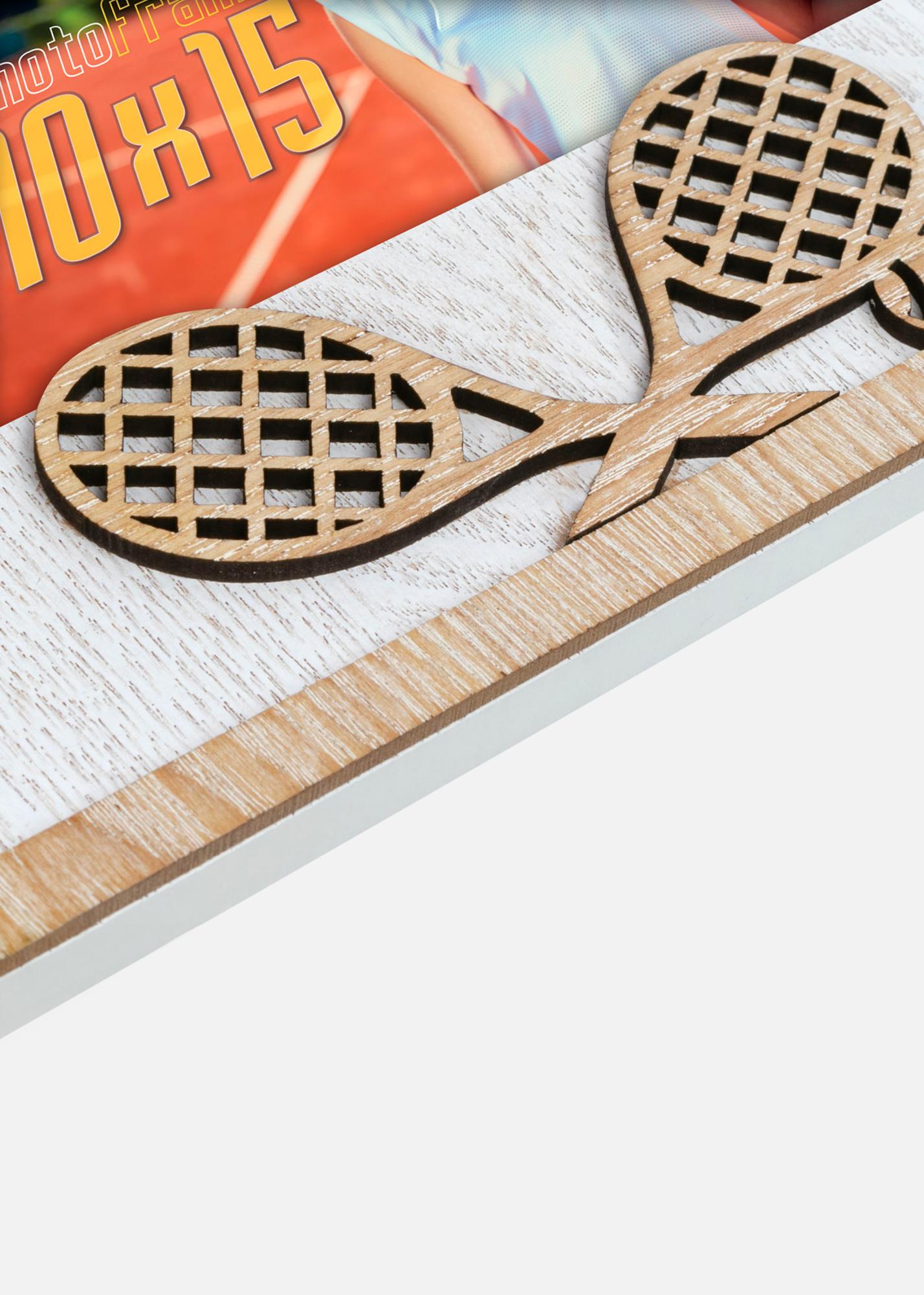 Sporditeemaline fotoraam tennisemotiiviga. Kaunistatud väljalõigatud tennisereketitega, ideaalne tenniseväljakul või spordiüritustel saadud mälestuste raamistamiseks. Sobib pildisuurusele 10x15 cm.
