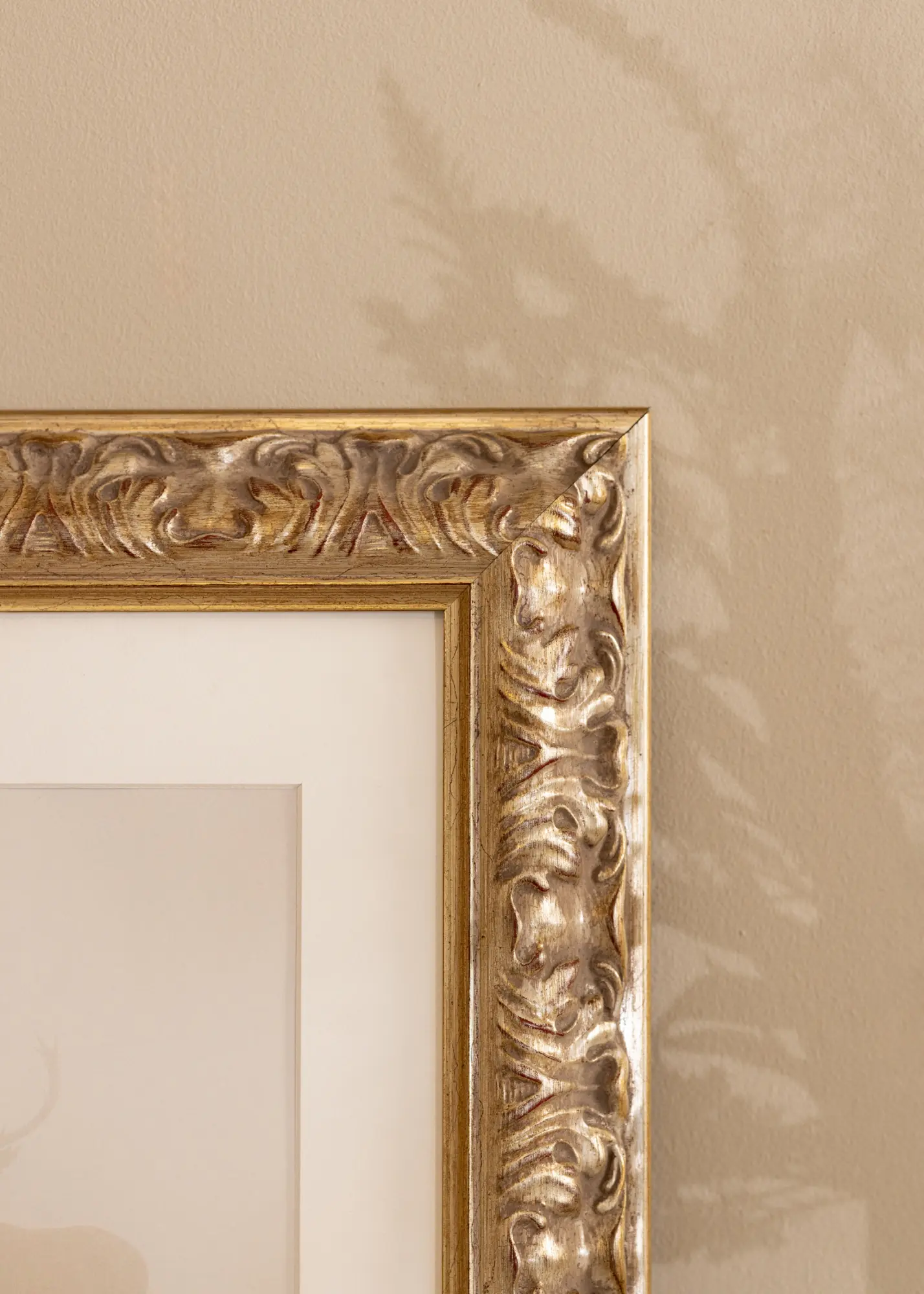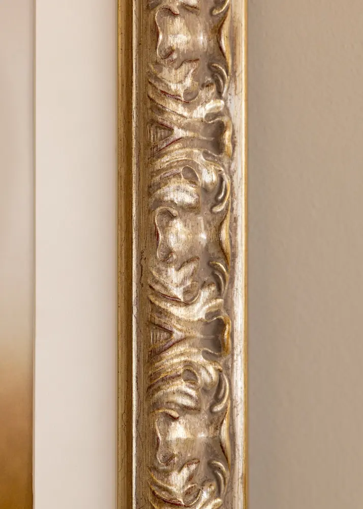 Raam Odin Hõbe on eritellimusel valmistatud pildiraam, mis pakub ideaalset elegantsi ja funktsionaalsuse kombinatsiooni. Oma antiikhõbeda viimistluse, peente kulddetailide ja diskreetsete punaste elementidega annab see fotoalus klassikalise ja elegantse ilme, mis tõstab esile iga kunstiteose või foto. Dekoratiivne disain teeb selle ideaalseks raamistamiseks, kus soovitakse elegantset tunnetust.