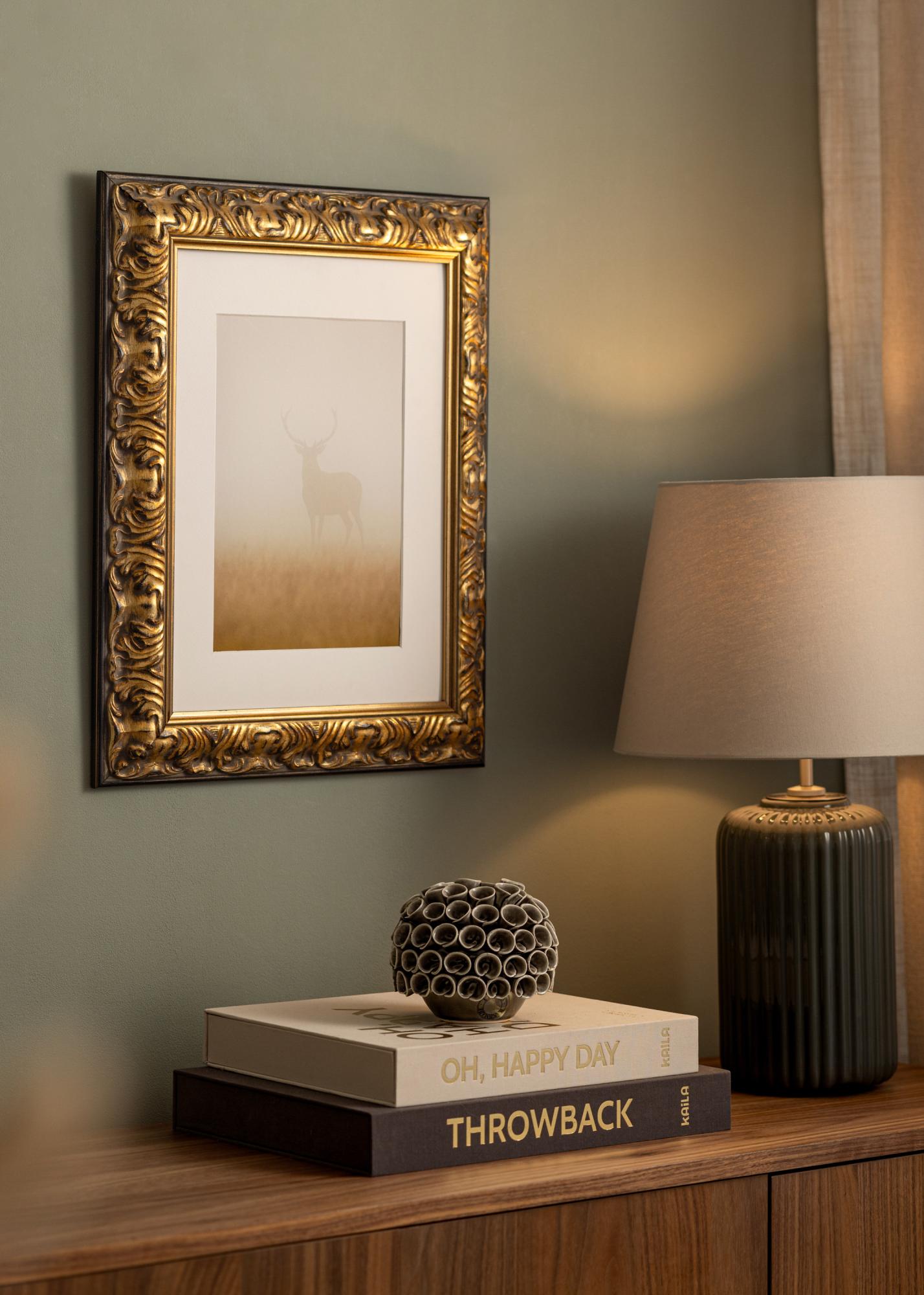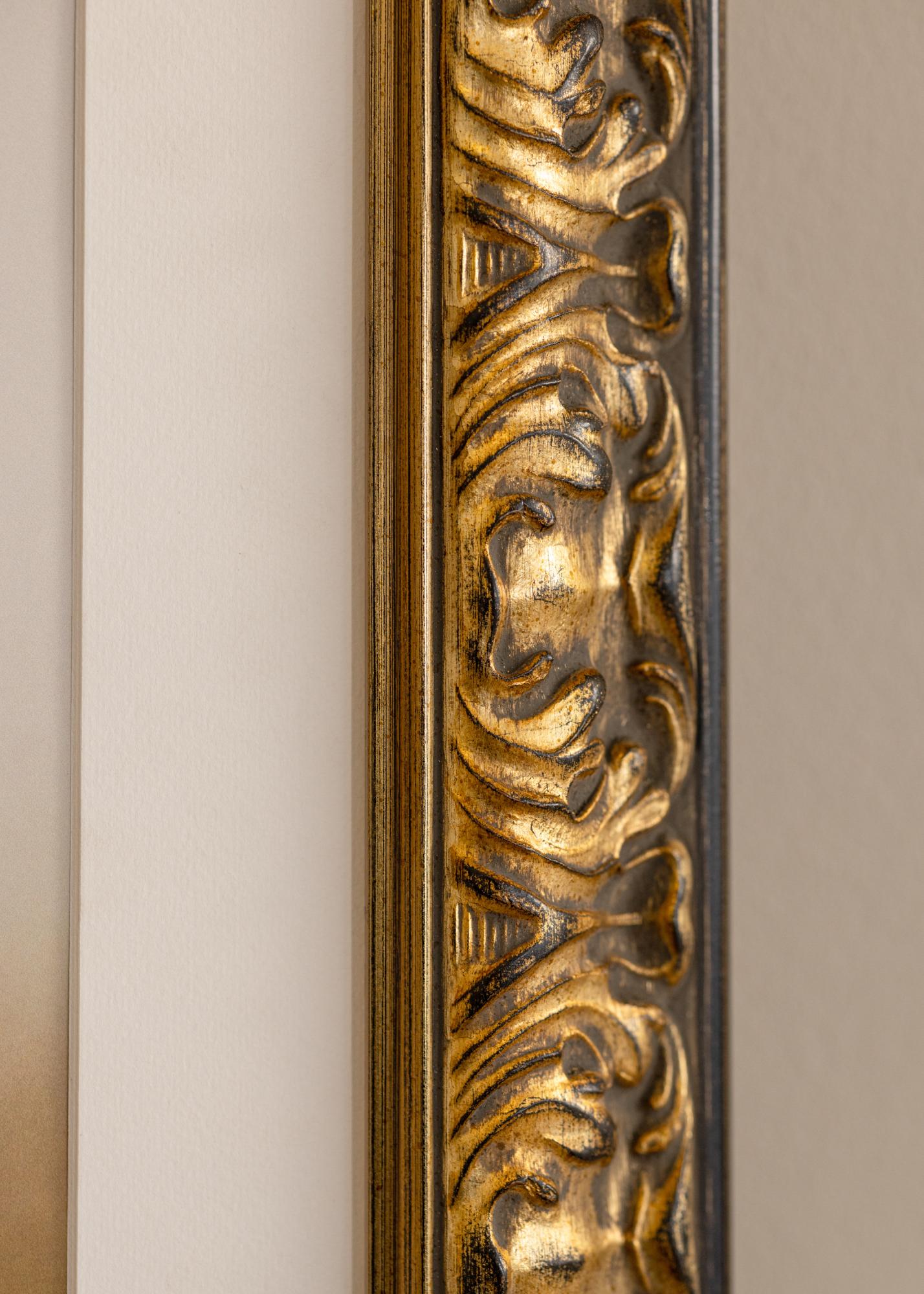 Meie kuldse ja musta värvikombinatsiooniga tellimuse järgi valmistatud Odin pildiraam on ideaalne valik kõigile, kes otsivad elegantset ja klassikalist raamimist. Oma kullaviimistluse ja mustade aktsentidega pakub see fotoraam antiikset tunnetust, mis tõstab esile iga kunstiteose või foto. Ornamentaalne disain loob kauni kontrasti sooja kulla ja sügavmustade detailide vahel, andes stiilse ja traditsioonilise ilme.