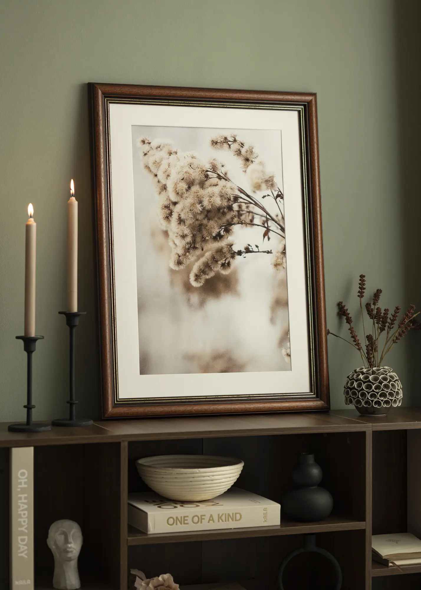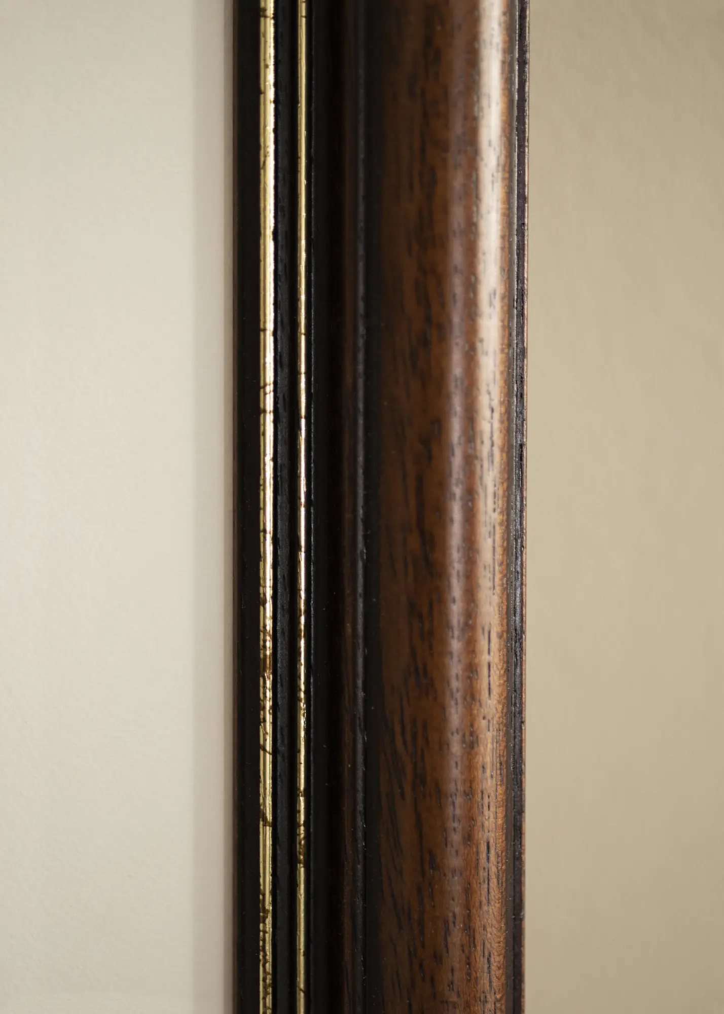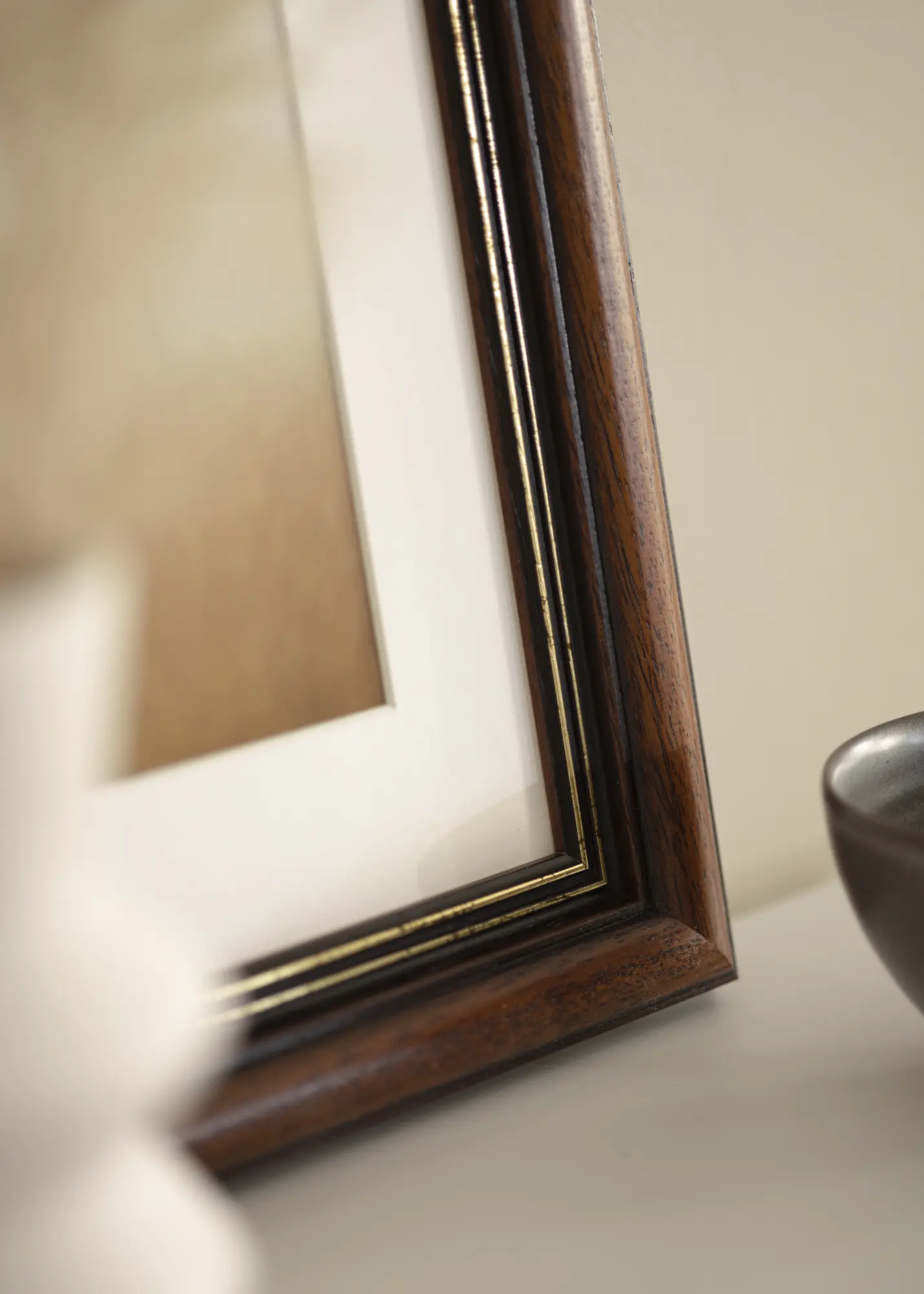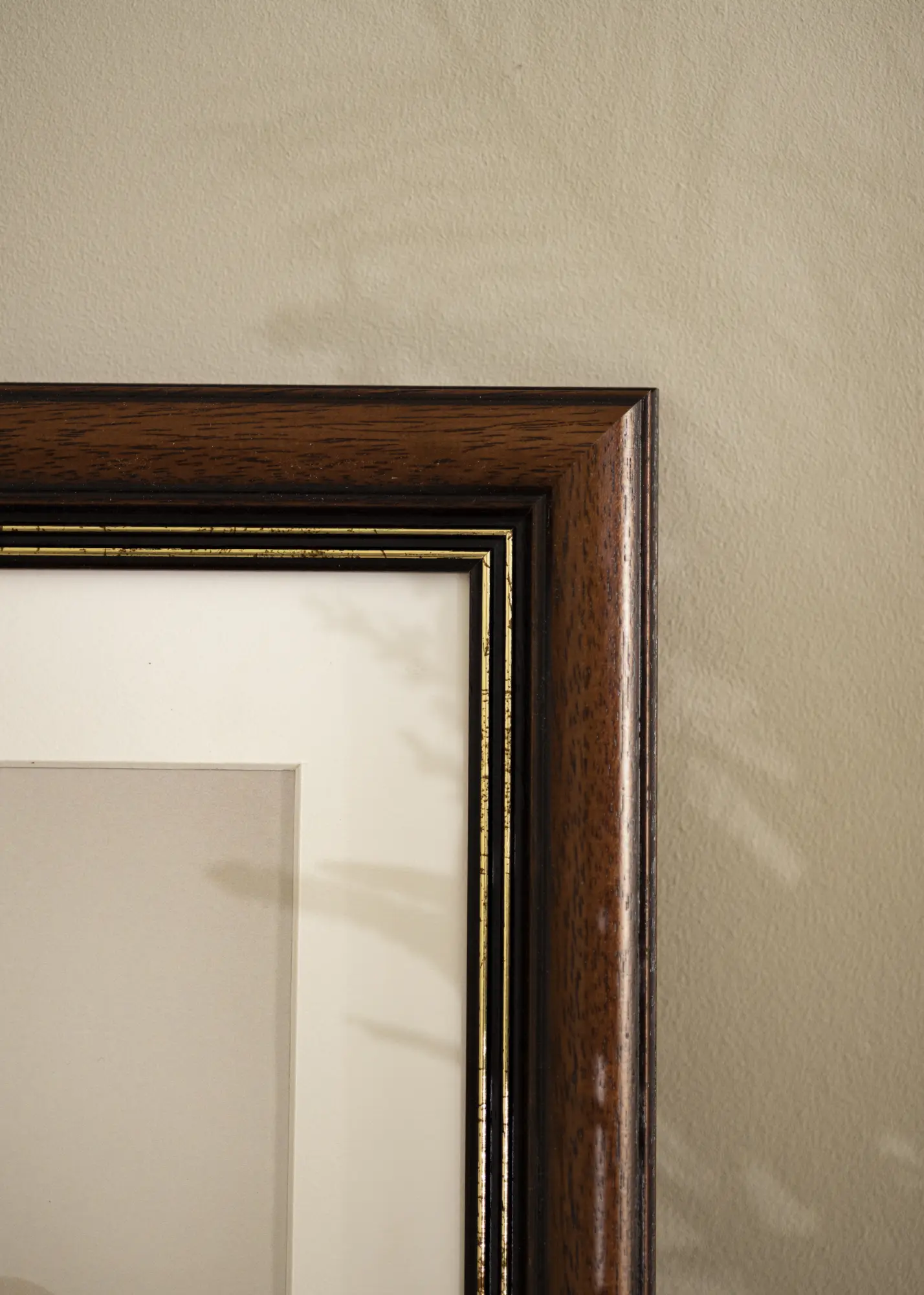 See kaunis puidust raam on klassikalise disainiga, sügava pruuni tooni ja traditsioonilise profiiliga, millel on mustad aktsendid. Kõige seespool, motiivi lähedal, jookseb ka kaks kullajoont, mis annavad teie motiivile luksusliku raamimise. Fotoraami on töödeldud ka elegantse kulunud ilme saavutamiseks, mis annab sellele ajaloolise välimuse.