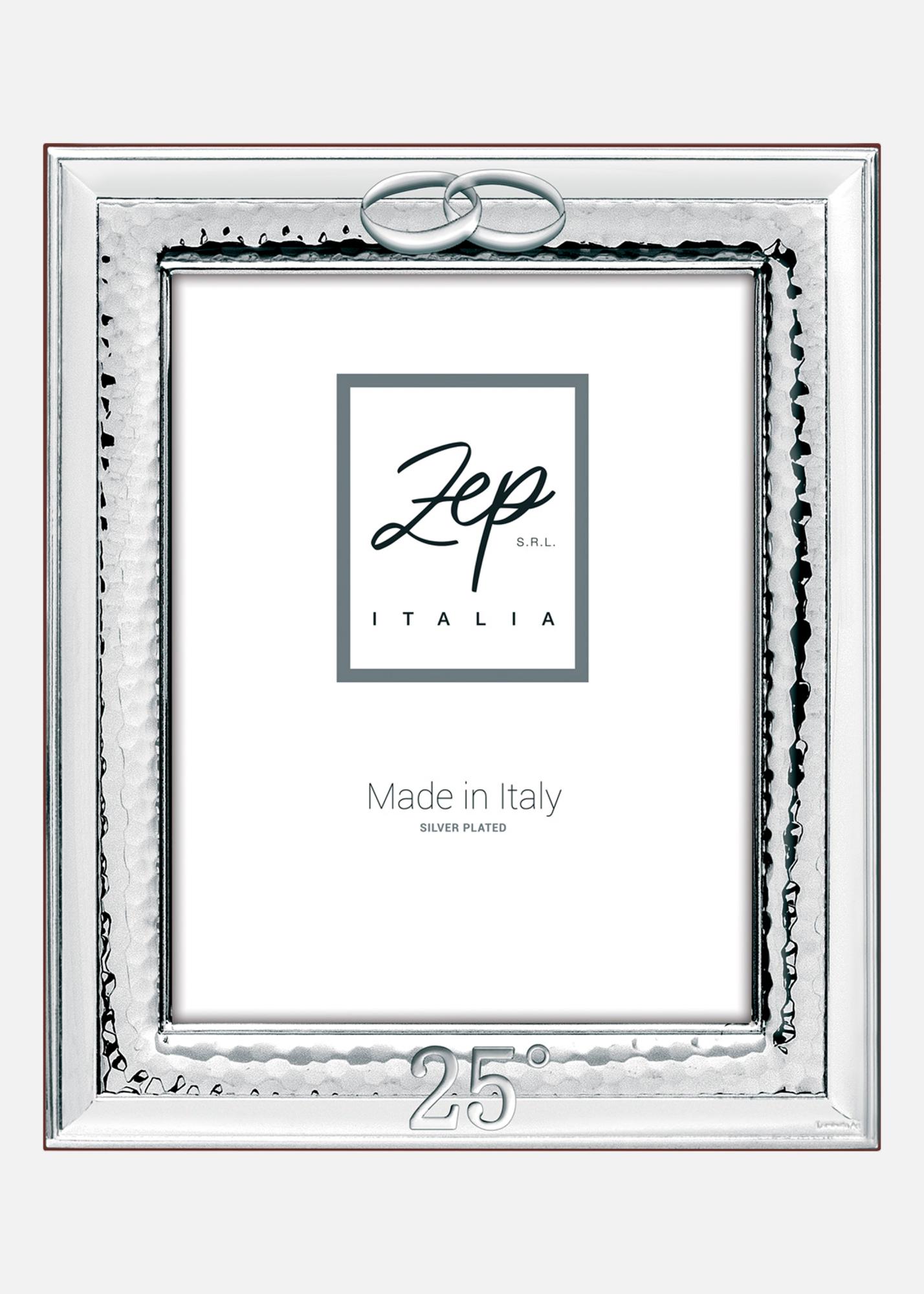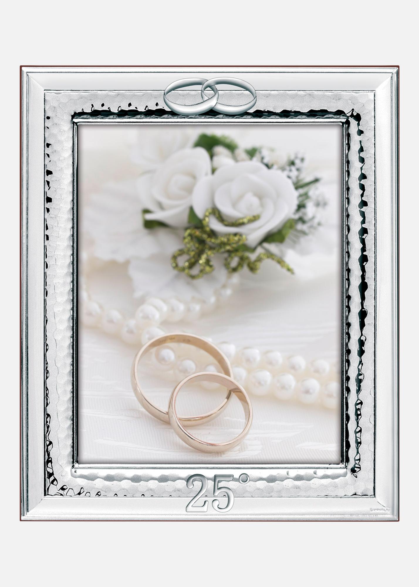 Elegantne hõbetatud pulmateemaline pildiraam. Üleval olevad ühendatud rõngad ja all number "25°" teevad selle ideaalseks 25. aastapäeva, näiteks hõbepulma, tähistamiseks.