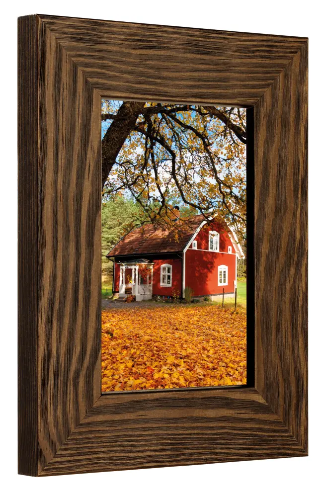 Tugev pruun puitraam nähtavate puidusüümustritega ja laia profiiliga. Sobib hästi, kui otsite tumedat puitraami loomuliku tundega. Ideaalne maastikufotode ja looduspiltide jaoks.