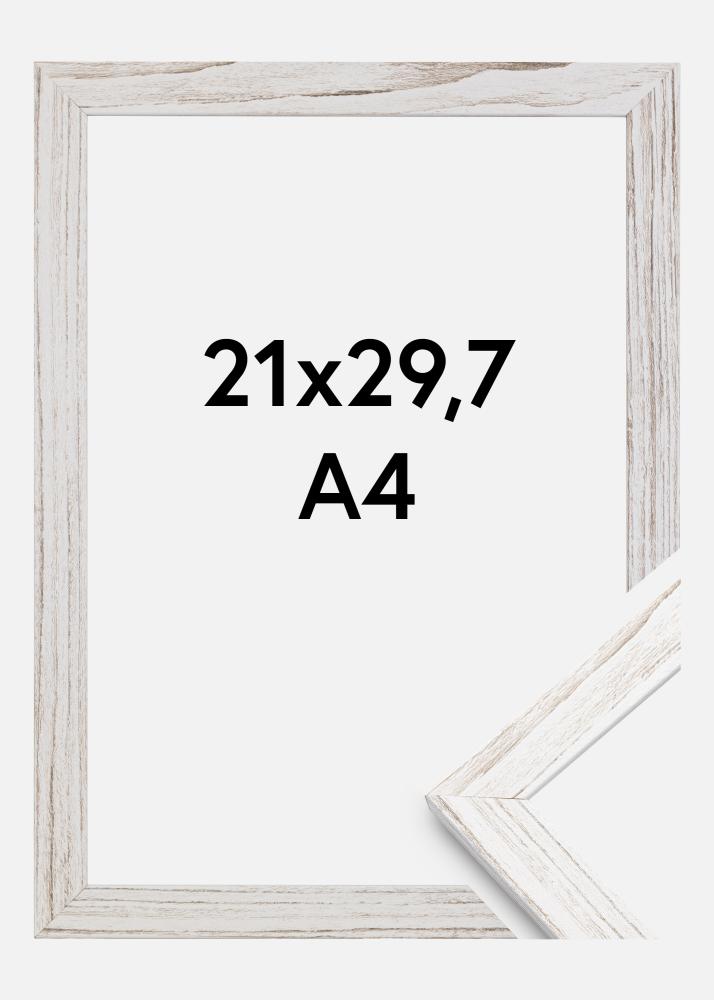 See on vintage disainiga raam. Raam on valget tooni pruunide täppidega, mis annab sellele raamile veidi rustikaalsema tunde. Raami liist mõõdab 20 mm laiust ja 14 mm sügavust. Raam on valmistatud männipuidust ja sellel on tõeline klaas. Vintage White on saadaval paljudes eri suurustes, mida saate stiilselt omavahel sobitada. See pildiraam on mõõtmetega 21x29,7 cm ja sobib A4 suuruses motiivide jaoks.