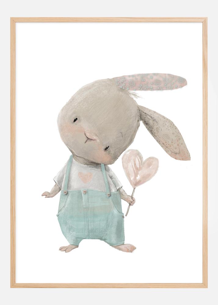 See võluv plakat kujutab väikest jänkut, kes hoiab südamekujulist õhupalli, maalitud akvarelltehnikas väljendusrikkuse ja tunnetusega. Jänku õrn, unistav pilk ja selle riiete peen detailrohked pastellvärvides lillemustrid loovad süütuse ja puhtuse tunde. See illustratsioon on imetlusväärne austusavaldus armastusele ja hoolivusele, mida väljendab südamekujuline õhupall.