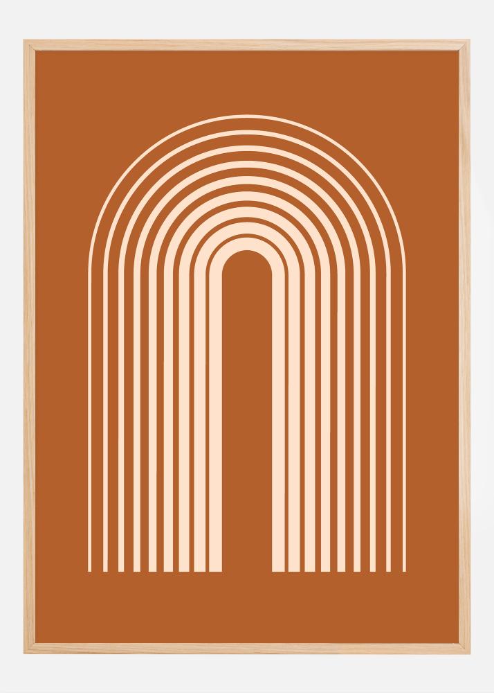 See plakat abstraktse poolkaare mustriga on austusavaldus modernsele kunstile ja disainile. Muster näib olevat täiuslikult sümmeetriliste kaarte seeria soojades, toonilistes värvides, mis annavad rahustava ja rütmilise visuaalse ilme. Järjest tumenev terrakota taust pakub sügava ja rikkaliku maastiku, millest heledamad jooned eristuvad, luues dünaamilise kontrasti, mis köidab pilku.