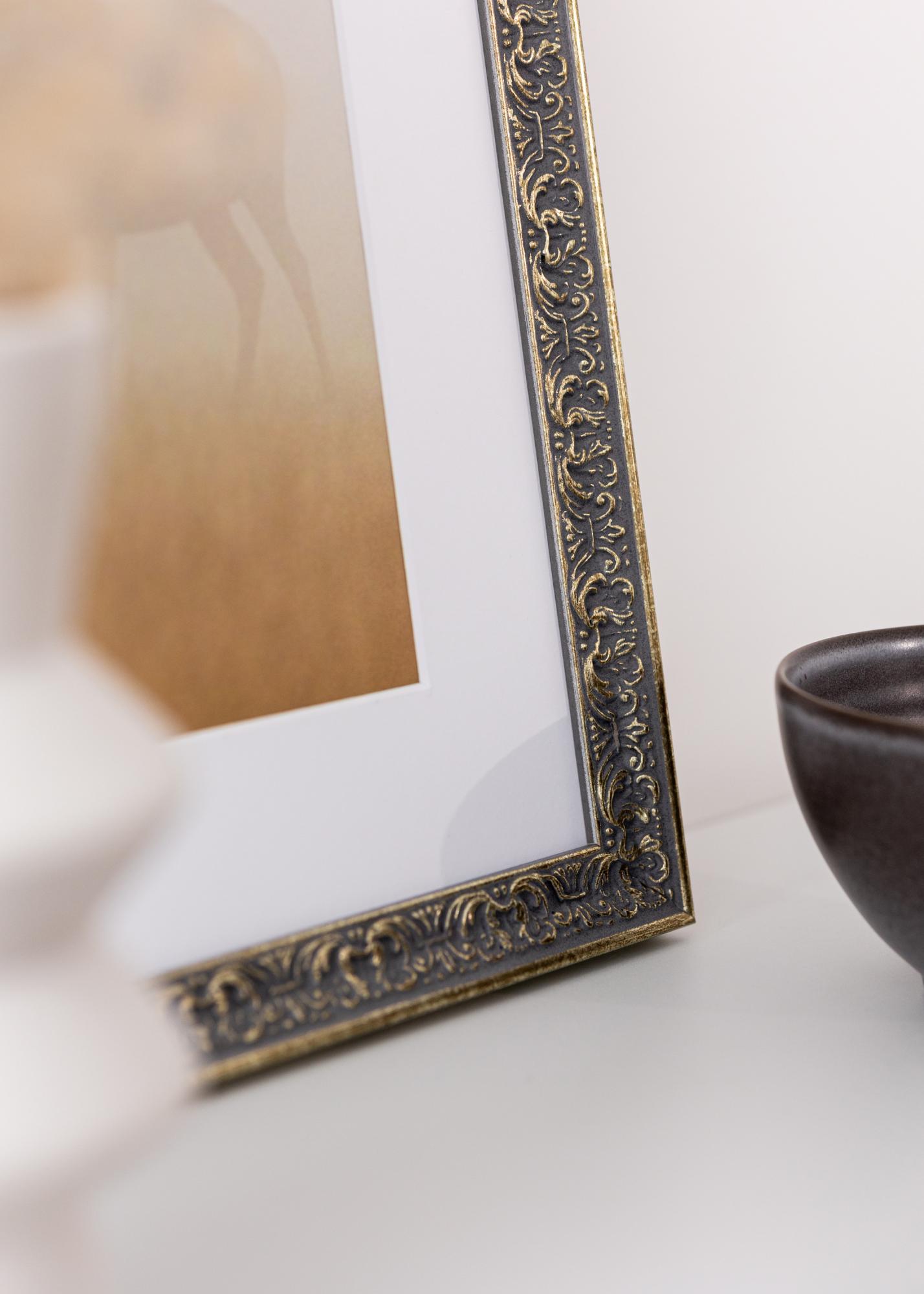 See elegantne pildiraam on täiuslik kombinatsioon klassikalisest disainist ja moodsast funktsionaalsusest. Oma 40x60 cm suuruse tõttu on see ideaalne, et esile tuua teie lemmikmotiivid ja luua teie kodus rafineeritud atmosfäär. Raam on valmistatud puidust ja sellel on kaunilt detailne ornament hallikas toonis, millel on kuldkollaseid elemente, andes sellele antiik-inspireeritud tunde ja elegantse patinaefekti.