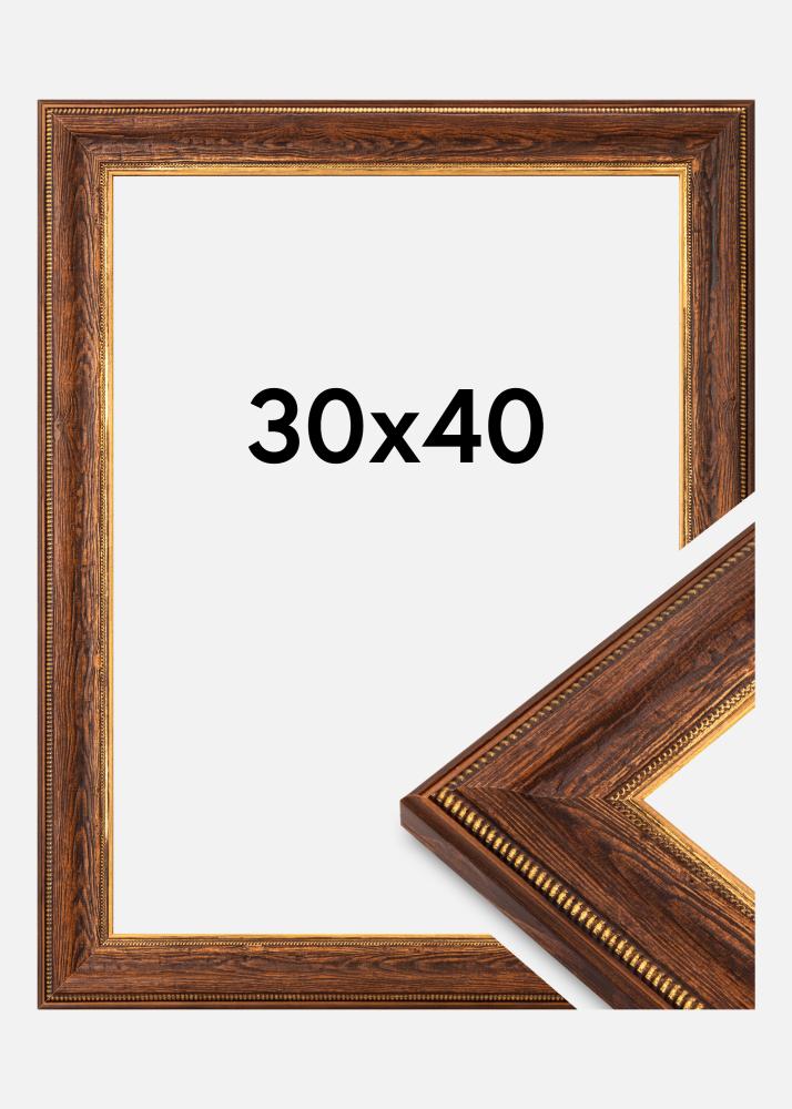 See elegantne pildiraam suuruses 30x40 cm on täiuslik kombinatsioon rustikaalsest võlust ja klassikalisest elegantsist. Valmistatud kõrgekvaliteedilisest puidust, on raam sügava ja sooja pruuni värviga, mis rõhutab puidu loomulikku struktuuri. Dekoratiivsed kulddetailid sisemise serva ääres annavad sellele peene puudutuse, muutes selle pildiraami ideaaliks traditsiooniliste ja vintage-stiilis sisustuste jaoks.