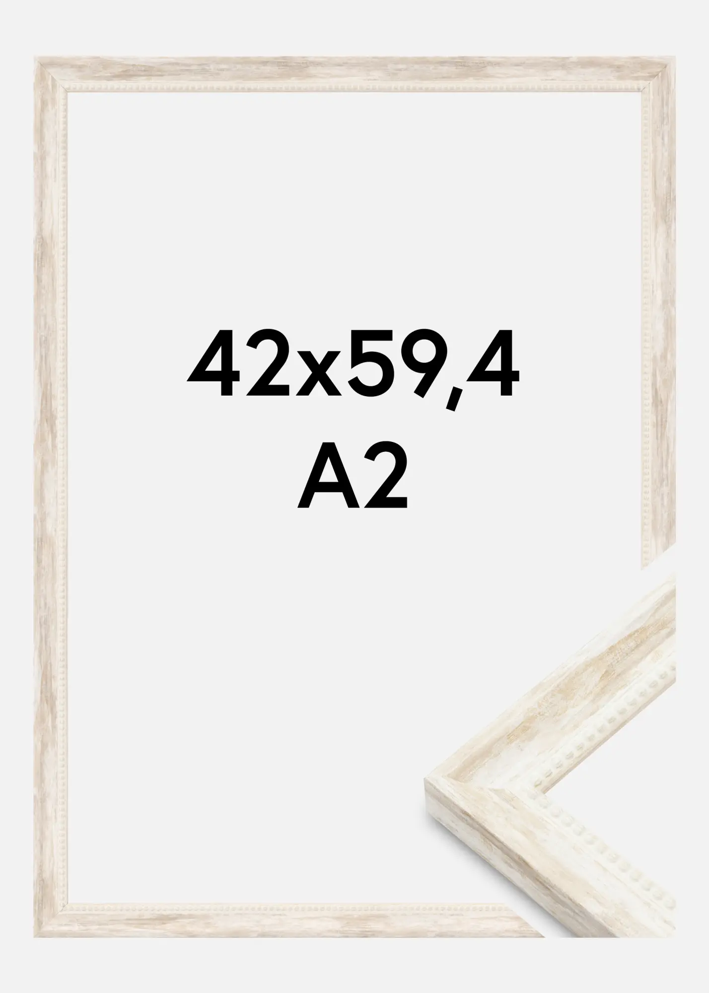 Avastage ilus pildiraam suuruses 42x59,4 cm, mis ühendab elegantsi maalähedase võluga. See valge pildiraam on valmistatud puidust ja omab peent antiikset tunnetust, mida tõstab esile dekoratiivne pärlservaga ääristus. Oma klassikalise ja detailirohke disainiga sobib see ideaalselt nii kunstiteoste kui fotode raamimiseks, olgu teie sisekujundus moodne või traditsiooniline.
