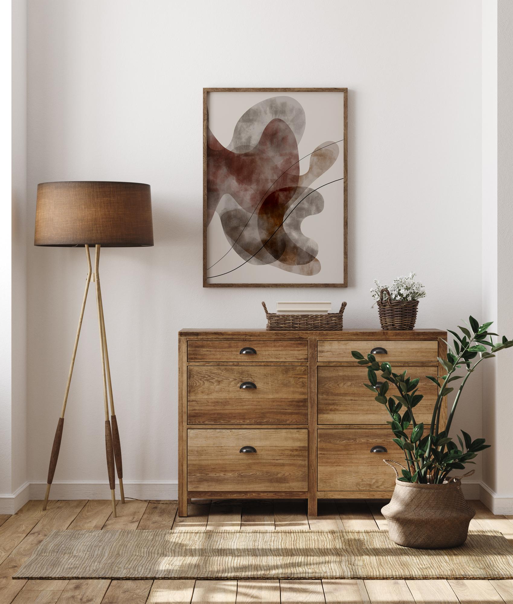 Abstraktne plakat omapäraste kujunditega erinevates värvitoonides, mis meenutavad merevetikaid. Kujundid on täidetud pehme pruuni, halli, roosa ja rohelise värviga, millel on uduviirguv toon. Kaks joont keerduvad dramaatiliselt üle kesksete kujundite, mis asuvad valgel taustal. Kombineerige pehmete pastelltoonidega taustaga, et luua huvitav vestlusteema.