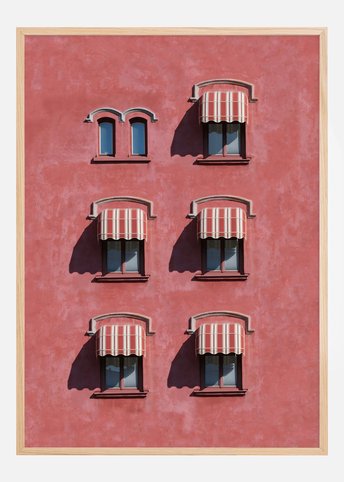 See elegantne ja rafineeritud plakat, "Punane sein", on arhitektuurilise harmoonia ja visuaalse tasakaalu näide. Kuus akent, igaüks eristuva markiisiga, kaunistavad elavat punast fassaadi ja annavad rütmilise sümmeetria, mis on silmale nii rahustav kui ka rahuldustpakkuv. Päikese mänglev tants üle pinna äratab struktuuri ellu ning loob valguse ja varju mängu.
