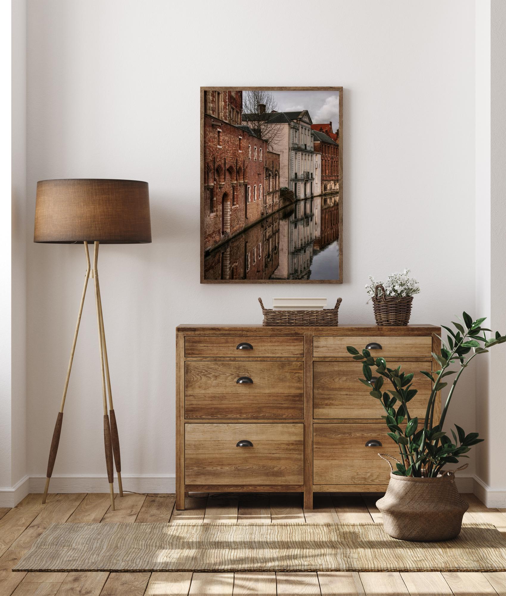 Nostalgiaposter ridade vanade majade kõrval jõega. Lihtsad, rustikaalsed, punased tellismajad ja nende arhitektuurilised detailid peegelduvad allpool olevas vaikset vett. Kujuta ette, et sa hõljud nende hoonete ääres, mõeldes möödunud ajale.