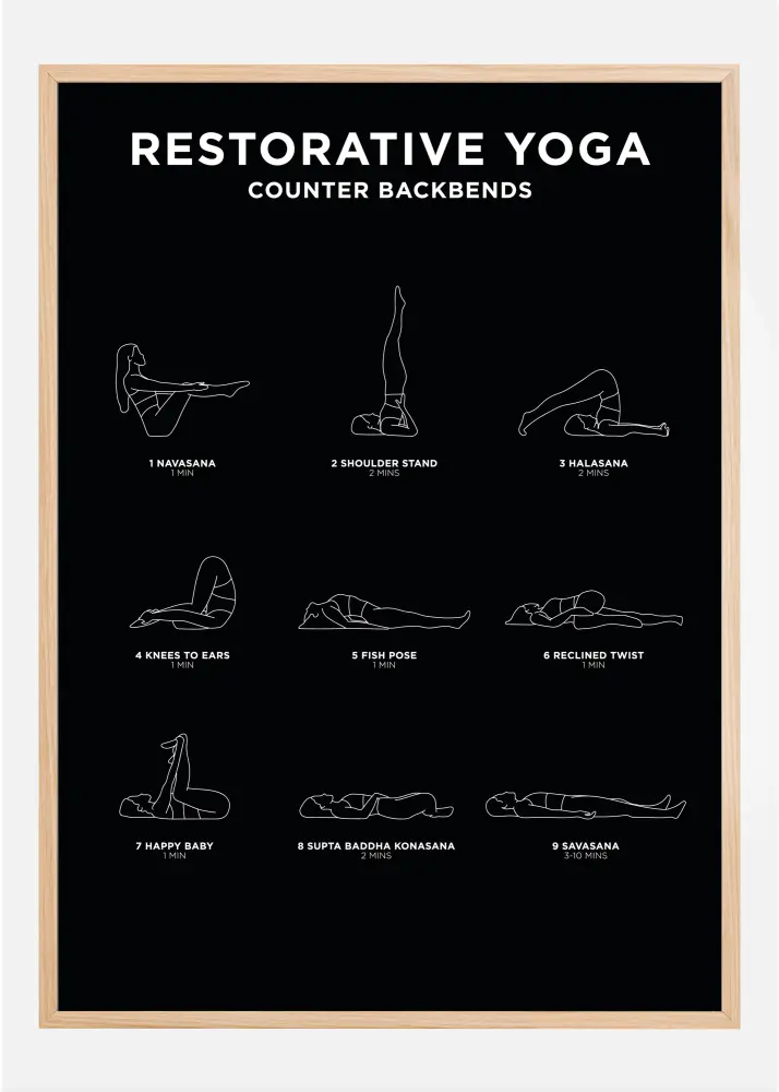 Õpi lõõgastuma taastava joogaga. See stiilne poster ei ole mitte ainult ilus sisekujunduselement, vaid annab sulle ka konkreetsed juhised selle lõõgastava joogastiili asendite kohta.