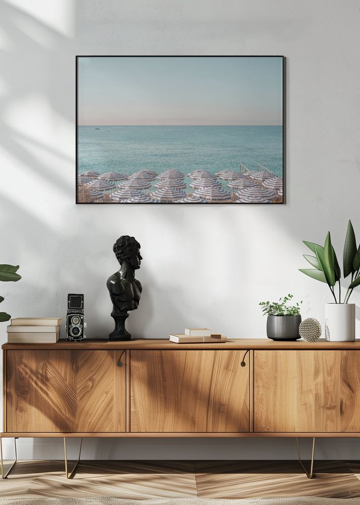 See plakat toob esile rannas valitseva lõõgastava õhkkonna, kus triibulised päikesevarjud Sinine ja Valge toonides laotuvad mööda liiva. Mere selge Sinine varjund sulandub taevasse pehmete pastelltoonidega, luues rahuliku ja suvise soojuse tunde. See plakat sobib suurepäraselt neile, kes soovivad oma koju tuua puhkuse ja mere meeleolu.