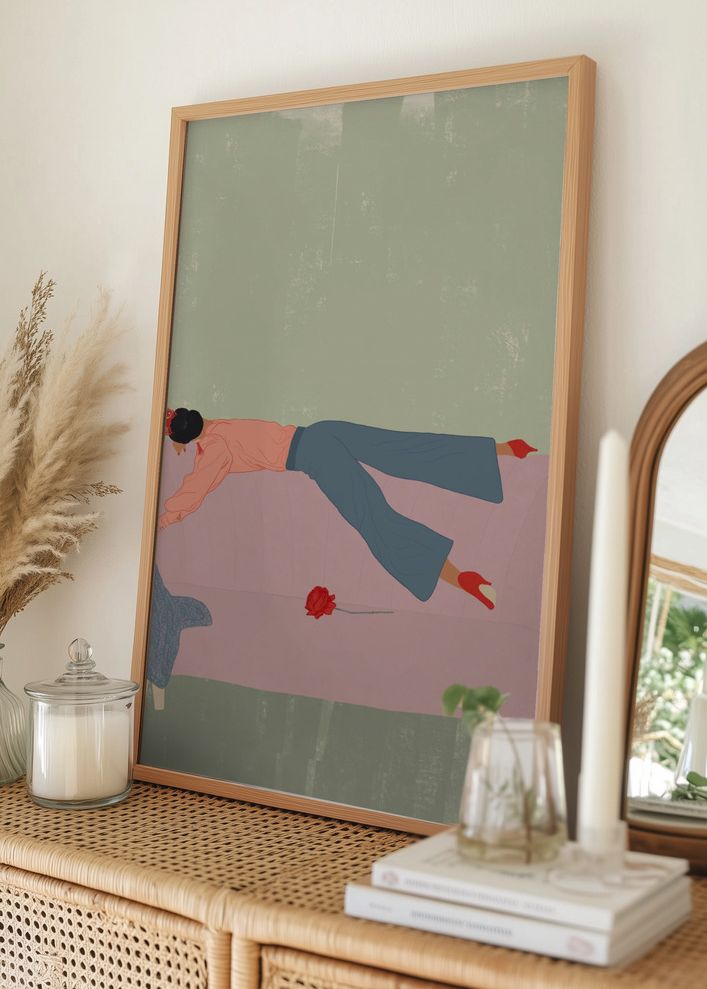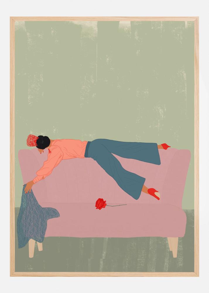 See plakat jäädvustab puhkehetke ja draamat värviküllases, stiilses motiivis. Naine lebab lõõgastunult välja sirutatult roosal diivanil, millel on punane roos istmel ja sinine tekk rippumas üle ääre. Tal on seljas korallpunane pluus, tume sinised laiad püksid ja punased kontsad. Tema juuksed on üles seatud ja kaunistatud mustrilise punase salliga, mis lisab peene retrohõngu ja elegantsi. See print sobib suurepäraselt sulle, kui otsid postrit, mis ühendab moe, puhkuse ja kunstilise väljenduse.